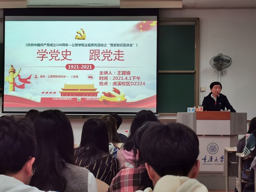 2021-04-13为加强党性修养,巩固信仰之力,响应习近平总书记在党史学习教育动员大会上的号召,同时促进“三会一课”常态化,2021年4月1日下午四点四十分至六点,在线色情 于虎溪校区综合楼223、224、302、304分别举办了“学党史跟党走,争做党的好青年”系列活动之建党100周年党史知识宣讲活动(党课)。本次活动由学院本科生一主办,主讲人为一支部书记王丽娟、二支部书记徐柳、一支部谢镇江以及李阳阳。18、19、20级全体预备党员、发...