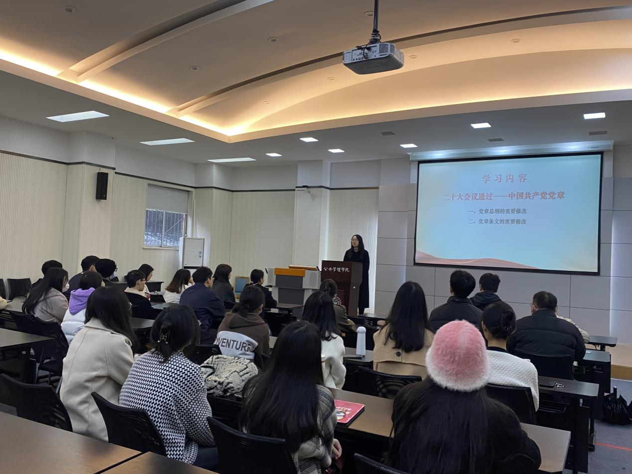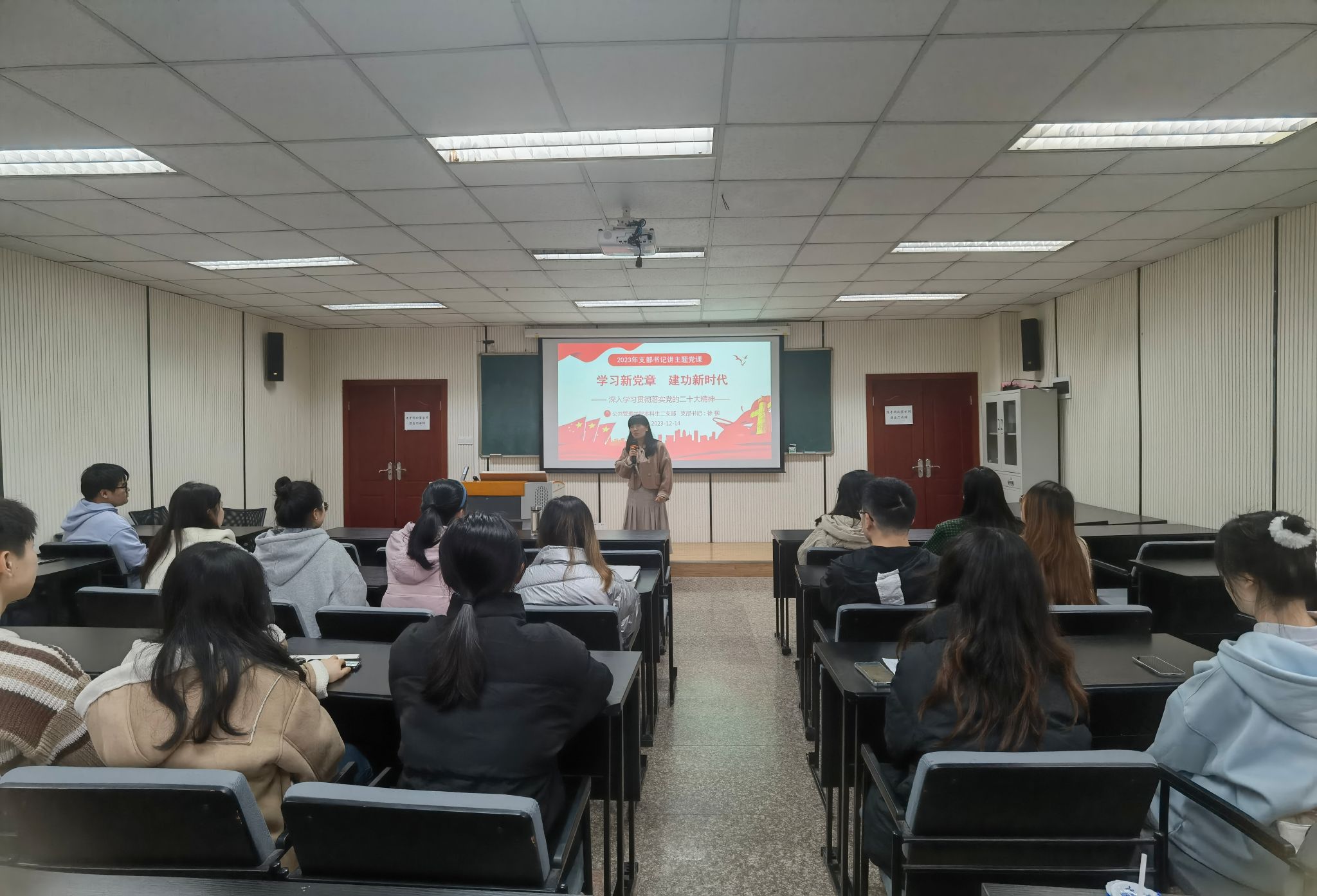 2023-12-25为深入学习党的二十大精神,扎实开展学习贯彻习近平新时代中国特色社会主义思想主题教育,引导带动学生党员进一步增强党的意识、党章意识、党员意识,更好地凝聚思想共识、增强前行动力,在线色情 本科生二支部书记徐柳、五支部书记陈致远于2023年12月14日下午在学院106教室为两个支部全体党员讲授了“学习新党章,建功新时代”的主题党课。首先,二支部书记徐柳围绕《中国共产党章程》的概况、党章的发展历程和学习新党章的...