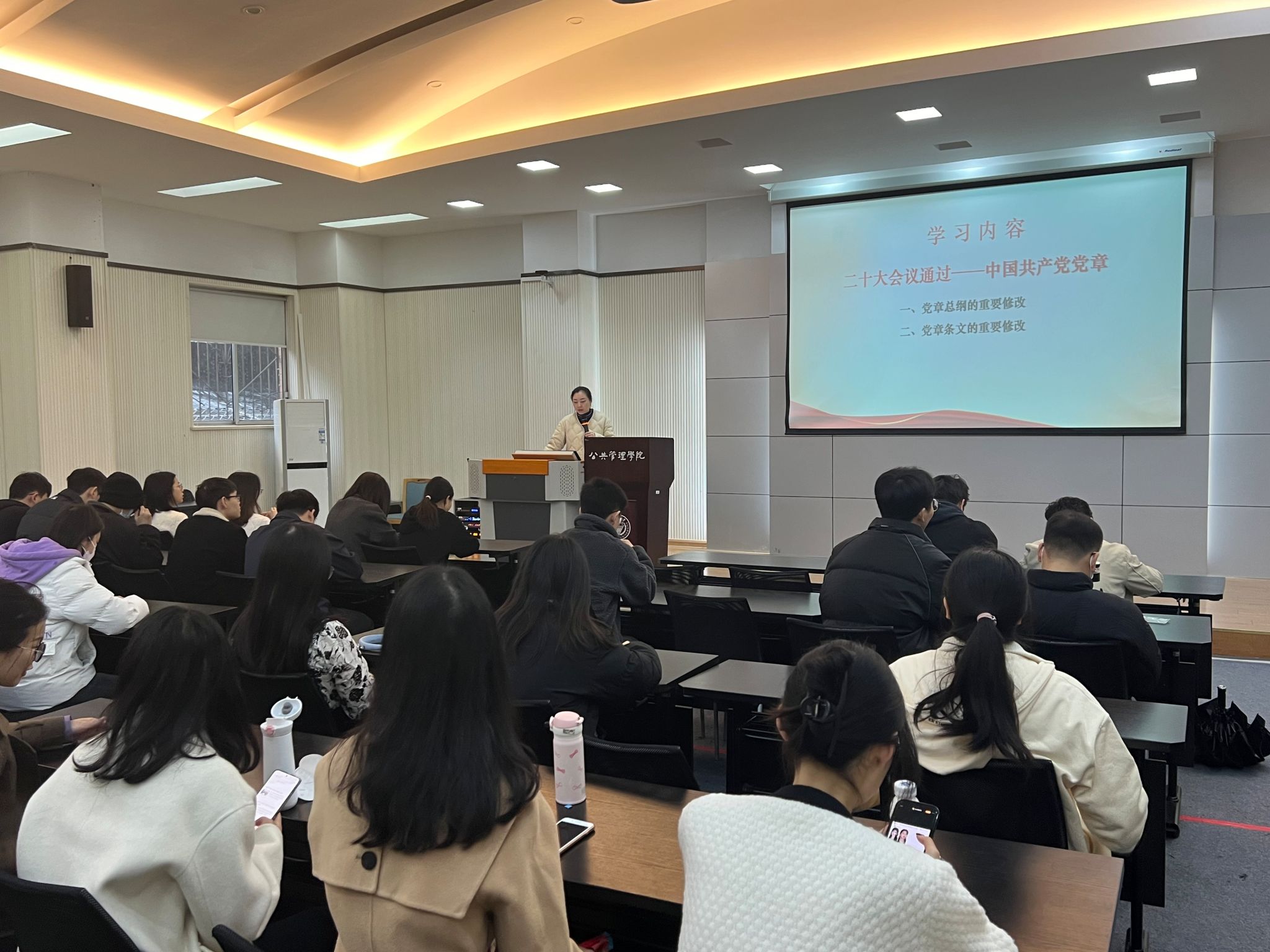 2023-12-08为进一步学习贯彻党的二十大精神,加强党员思想淬炼,夯实理论武装,在深学细照笃行中提升政治素质,11月30日下午,研究生五支部书记裴绍蓉带领研究生五支部全体党员专题学习《中国共产党章程》。裴绍蓉围绕党章的重要地位、党的二十大对党章的修改、学习贯彻新党章的核心内容进行了系统阐释和深入解读。通过分享微动漫系列片《二十大党章新知识点大家学》,用通俗易懂、鲜活生动的动漫形式介绍党章的主要修改知识点,加深学生...