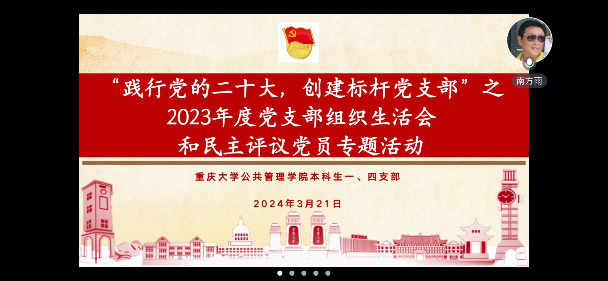 2024-03-222024年3月21日上午,学院本科生一、四支部联合举行了“践行党的二十大、创标杆支部”之2023年度党支部组织生活会与民主评议党员专题活动。鉴于存在2019级本科毕业生党员组织关系暂时挂靠于学院本科生一、四支部的特殊情况,本次民主评议活动特别采取了线上线下同步进行的方式。在校党员在学院楼104教室进行线下评议,确保评议活动能够全面覆盖、顺利进行,同时保证每位党员都能充分参与并发表意见,进一步促进党内民主,提升组...