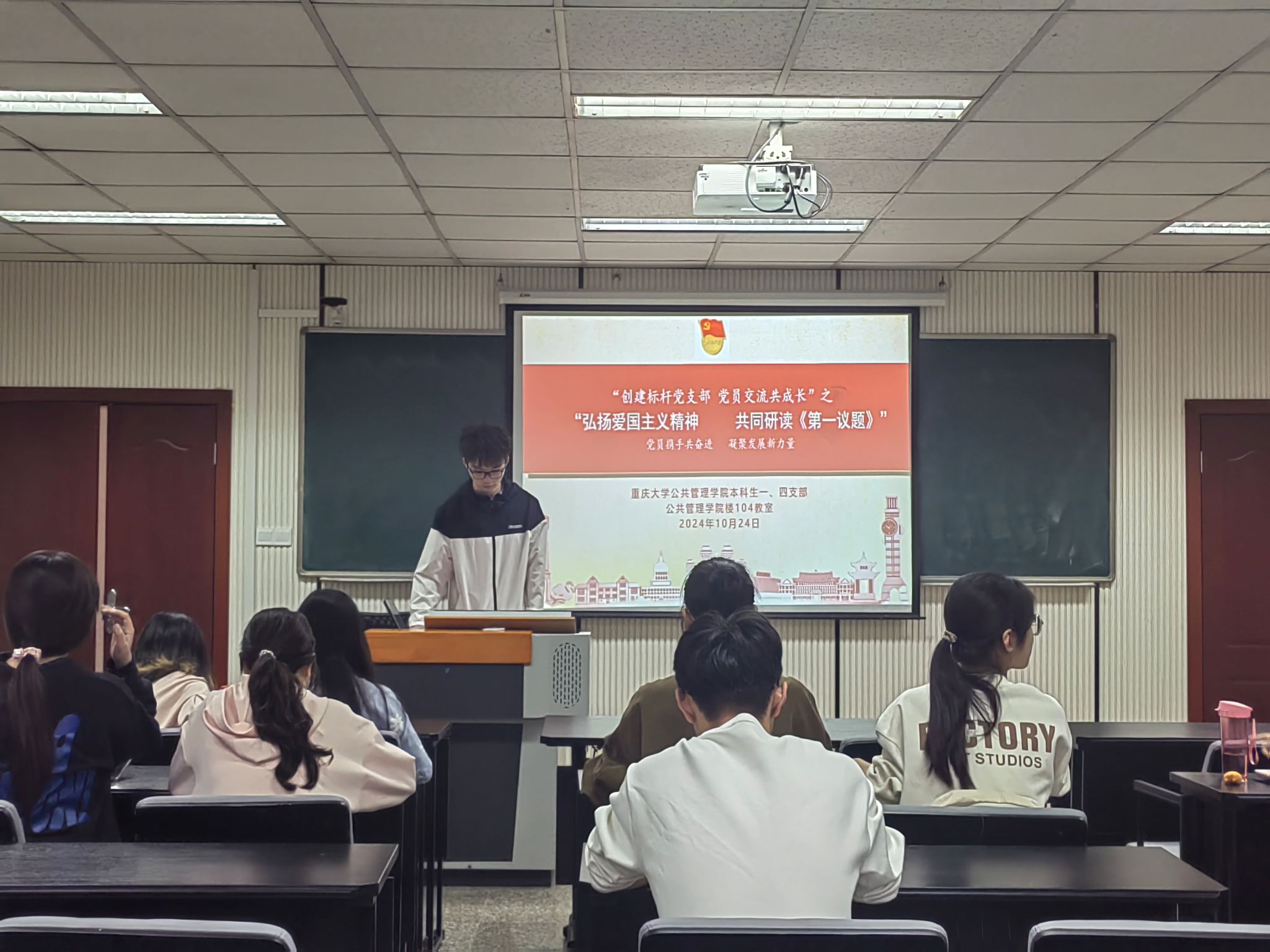 2024-10-28为了加强党的政治建设,提高党员干部的政治站位和政治能力,确保党的理论和路线方针政策得到全面贯彻和执行。2024年10月24日下午15:00,在线色情 本科生一、四支部全体党员、预备党员于学院楼104教室开展“创建标杆党支部——党员交流共成长”之“弘扬爱国主义精神、共同研读《第一议题》”主题活动。本次活动由朱雨同志进行主持。他从聆听习近平总书记教诲、具体要求、我们在行动三个方面带领大家进行了《第一议题...