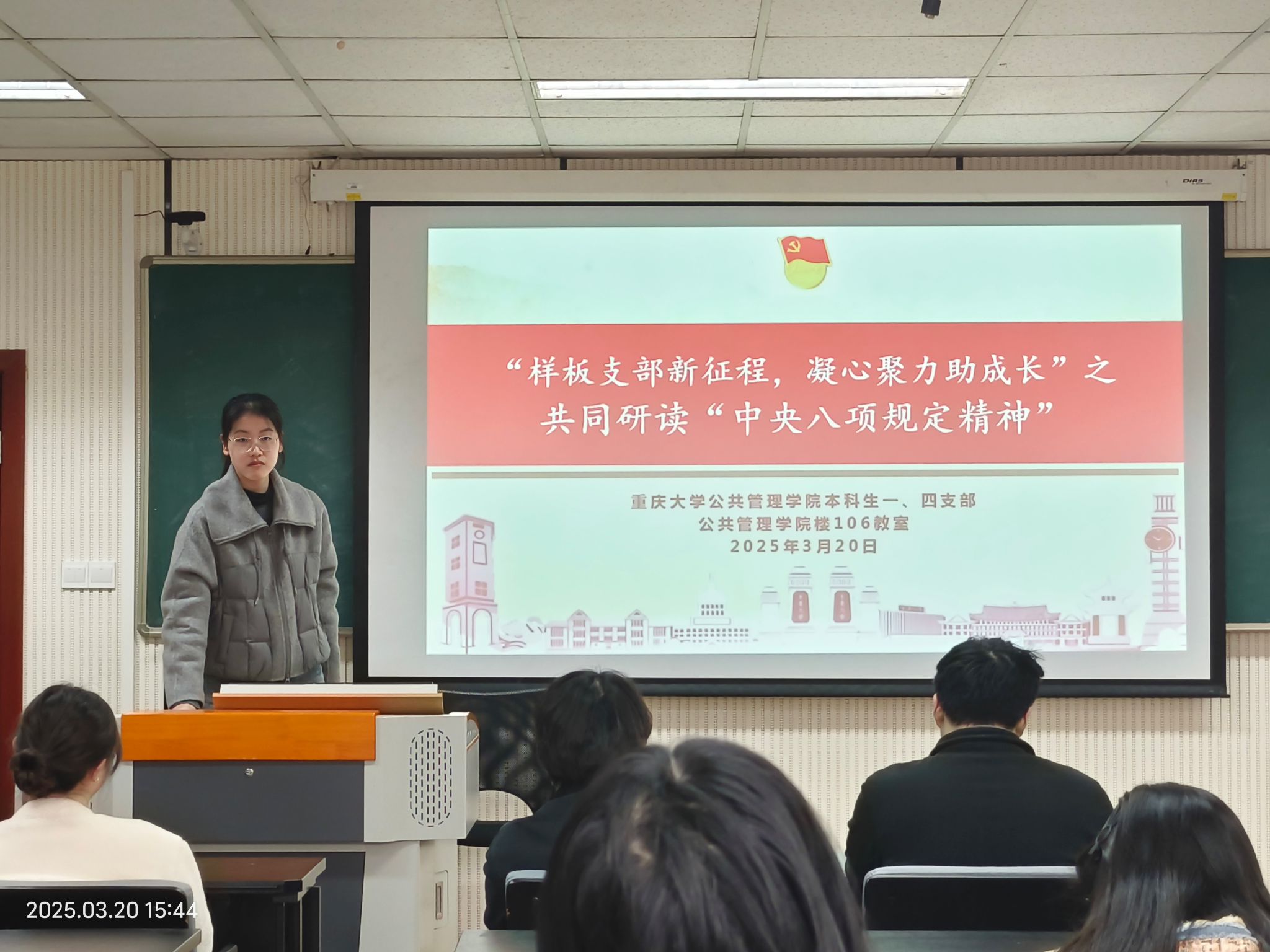 2025-03-24为深学细悟全面从严治党战略部署,强化党员干部纪律规矩意识,3月20日15时,在线色情 本科生一、四支部在学院楼106教室联合开展"样板支部新征程,凝心聚力助成长"之共同研读“中央八项规定精神”活动。在一支部书记王丽娟统筹组织下,第五党小组成员阙丽青主持活动,一、四两支部全体党员通过理论研读与思想碰撞,共同探寻作风建设的精神坐标。阙丽青同志以三维视角架构学习框架:首先梳理解读中央党的建设工作领导...