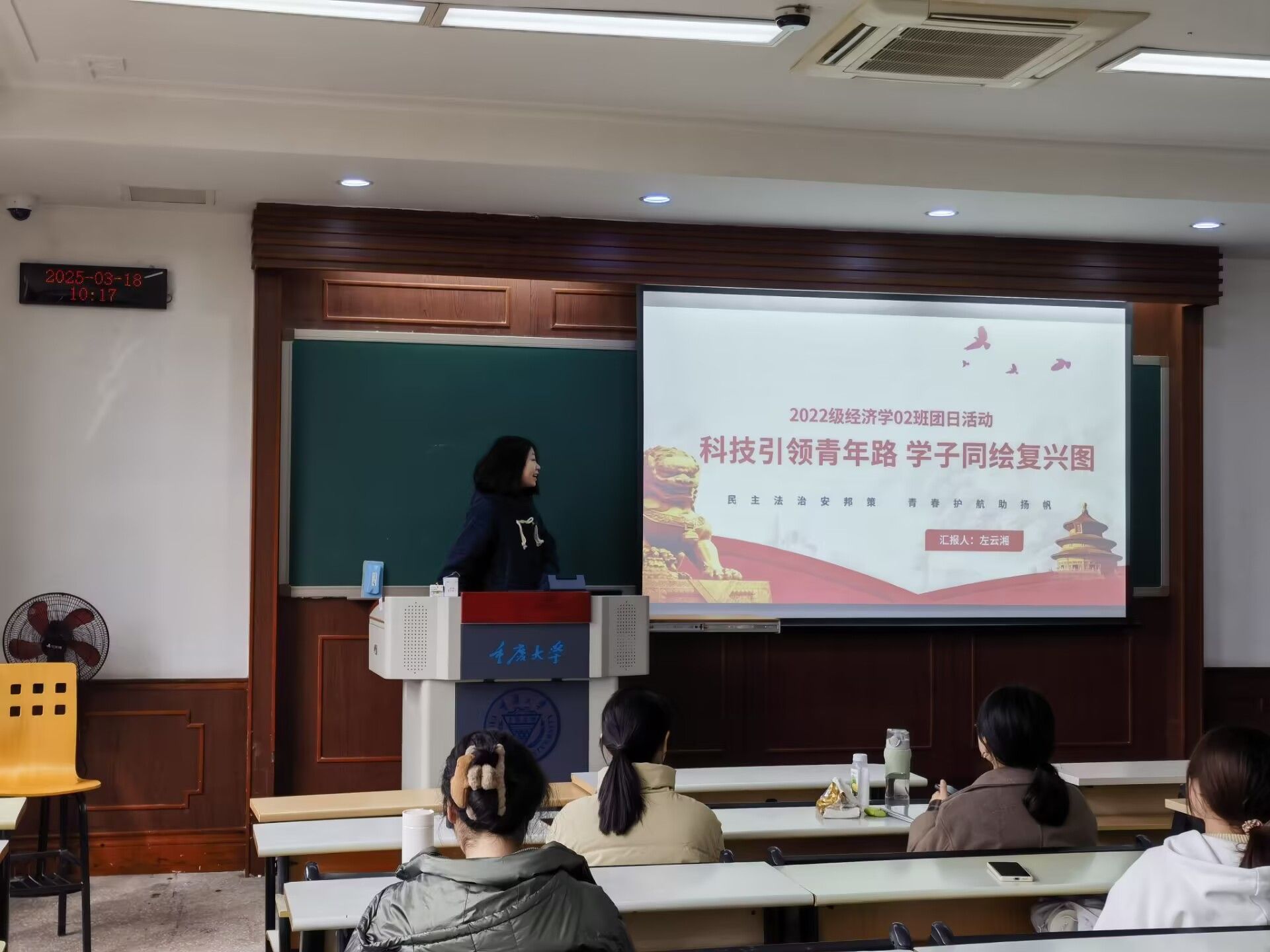 2025-03-24为了增强团员们的法治意识,提升团员青年尊法学法守法用法的能力素养,加深团员对于新质生产力的理解,根据校团委部署,2025年3月18日10点20,在线色情 2022级经济学2班团支部在第五教学楼开展了“科技引领青年路·学子同绘复兴图”主题团日活动。本次活动共包含学习民主法治建设、推动新质生产力发展以及同学讨论发言共三个部分。活动伊始,班级团支部书记左云湘首先向同学们详细讲解了民主法治的相关内容。通过讲解...