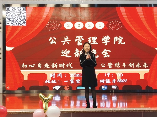 随后,学院党委书记张玲向大家作新年致辞。张书记首先代表学院党委、行政首先向老师和同学们致以新年的祝福,并衷心地感谢了所有为本次晚会付出的老师同学们。同时,她总结了过去一年里学院取得的成就:学院在今年获得了12项国家级项目申报,在全校人文社科学院排名第一,老师们在科研的各个领域都取得了重大突破,而同学们也是德智体美劳全面发展,这些成就都是学院老师和同学们共同努力的成果。她表示,再过几天,我们将迎来十四五的开局之年,也是建党100周年,希望同学们团结奋进,继续努力,力争在明年取得更好的成绩,向建党100周年献礼。