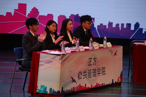 本次大决赛,学院辩论队对阵的是管理科学与房地产学院辩论队。主席首先隆重介绍了赛事历史、参赛双方和本次到场的五位评委,并依次介绍了两队辩手及辩题。本场比赛的辩题是信仰究竟是不是人类进步与发展的必需品。学院辩论队为正方,认为信仰是人类进步与发展的必需品。两支队伍枕戈待旦,大战一触即发。