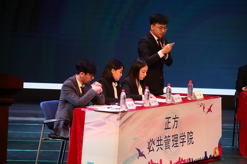 在接下来的环节中,双方辩手分别就对方的论点展开驳论,你来我往,战况激烈。在唇枪舌剑中,在一个又一个回合的交锋中,观众席不断地爆发出掌声与喝彩。在最后的点评环节,评委说到本场比赛的双方确实势均力敌,各有千秋。在文风上,学院辩论队获得了评委的一致青睐。评委也特别提到,学院二辩谢欣露的从容与条理令人印象深刻;四辩刘洋儒雅的气质则让人在剑拔弩张的辩论场上也如沐春风。