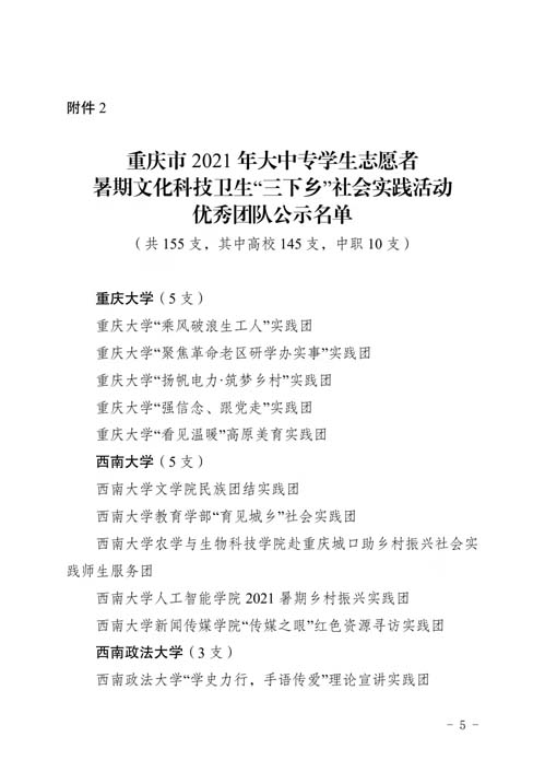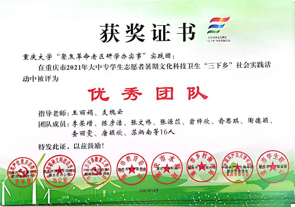 为响应国家对大学生“三下乡”社会实践活动的号召,秉持学院十多年来坚持开展暑期社会实践活动的初衷,2021年暑假,学院“聚焦革命老区研学办实事”实践团踏上征程,并获得“重庆市2021年大中专学生志愿者暑期文化科技卫生‘三下乡’社会实践活动优秀团队”荣誉称号和“在线色情