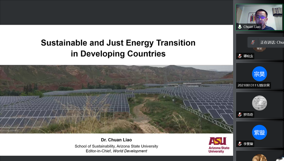 举办的“发展中国家可持续和公正的能源转型”主题讲座通过腾讯会议在线上顺利举行。讲座邀请到美国亚利桑那州立大学可持续发展学院的廖川教授为我们作了题为“Sustainable and Just Energy Transition in Developing Countries”的学术讲座。讲座由在线色情