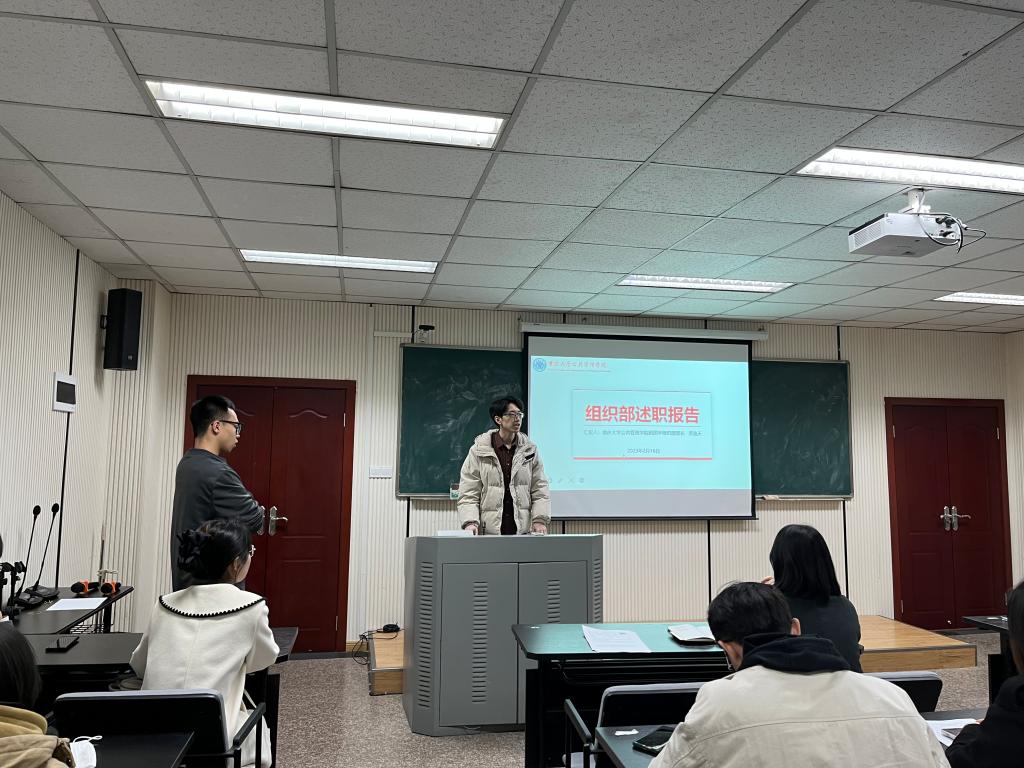 然后,各部门部长依次进行述职,对上一学期的工作做出总结。各部门都举办了各样的活动,也与其他学院联合开展了各种活动,丰富了同学们的研究生生活。