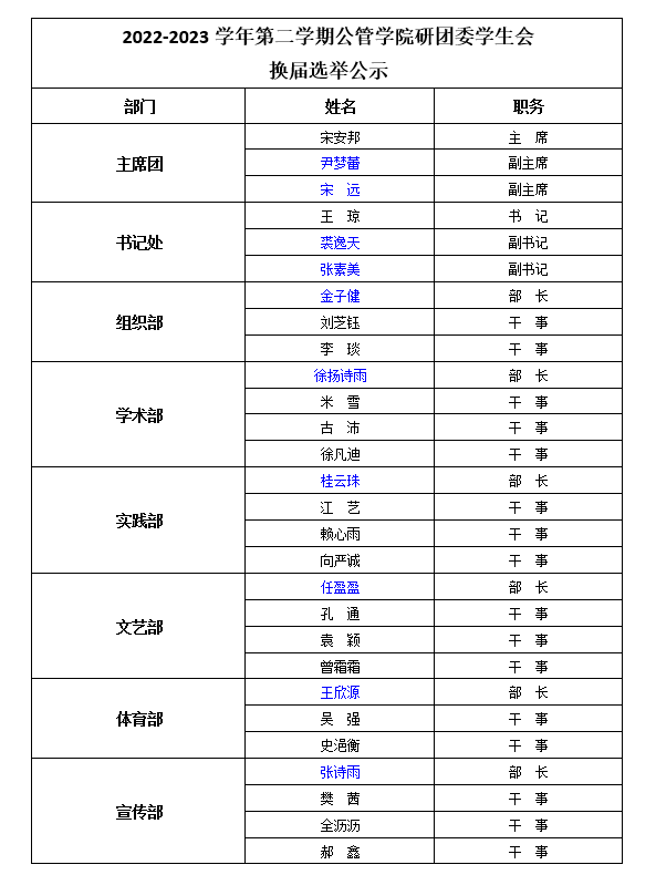 至此,本次换届大会在掌声中圆满结束。最后对竞选结果作出如下公示。相信新一届研团学会让新学期的学生工作迈上新的台阶。