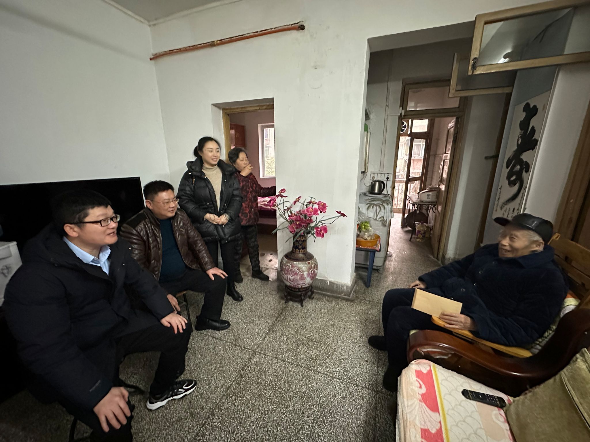 近日,中共中央组织部下发通知,要求各级党组织在元旦春节期间开展走访慰问生活困难党员、老党员、老干部活动。根据学院党委统一安排,2024年1月15日,学院党委副书记、纪委书记周余斌,副院长王辉,党委办公室何薇,行政办公室孙科、夏艺代表学院党委走访慰问生活困难党员、老党员、老干部,向他们送去党的关怀和组织的温暖,致以节日的祝福和诚挚的问候。