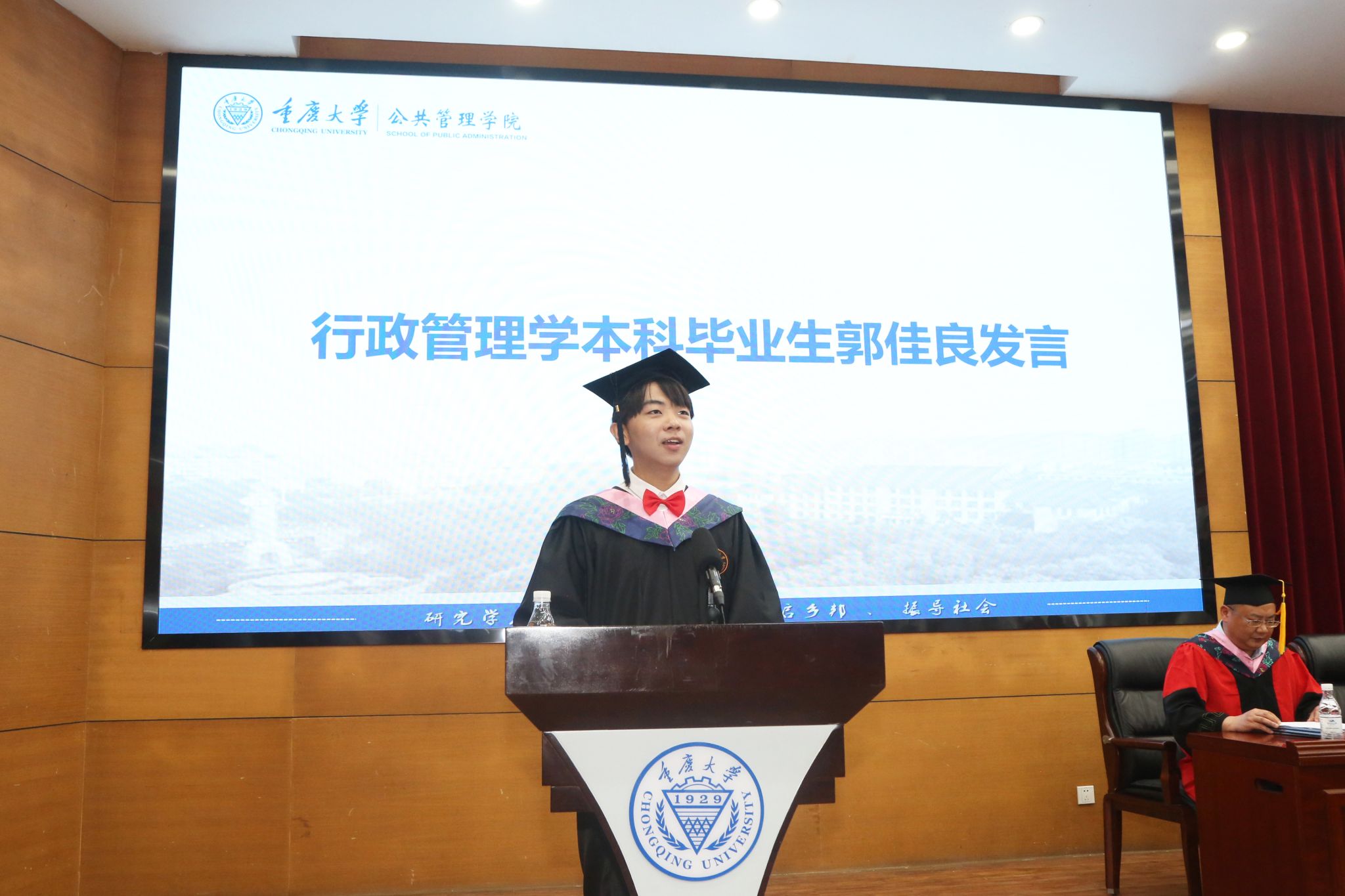 学术学位硕士毕业生代表王琼发言,她回顾过去的日子感慨万分并满怀憧憬。她向母校及学院致以最诚挚的谢意。她希望各位同学牢记“耐劳苦,尚简朴,勤学业,爱国家”的校训,胸怀远志、手握蓝图,昂扬思想、踏实脚步,让“尚道至公,管泽天下”的精神成为重大公管人闪耀的光环。