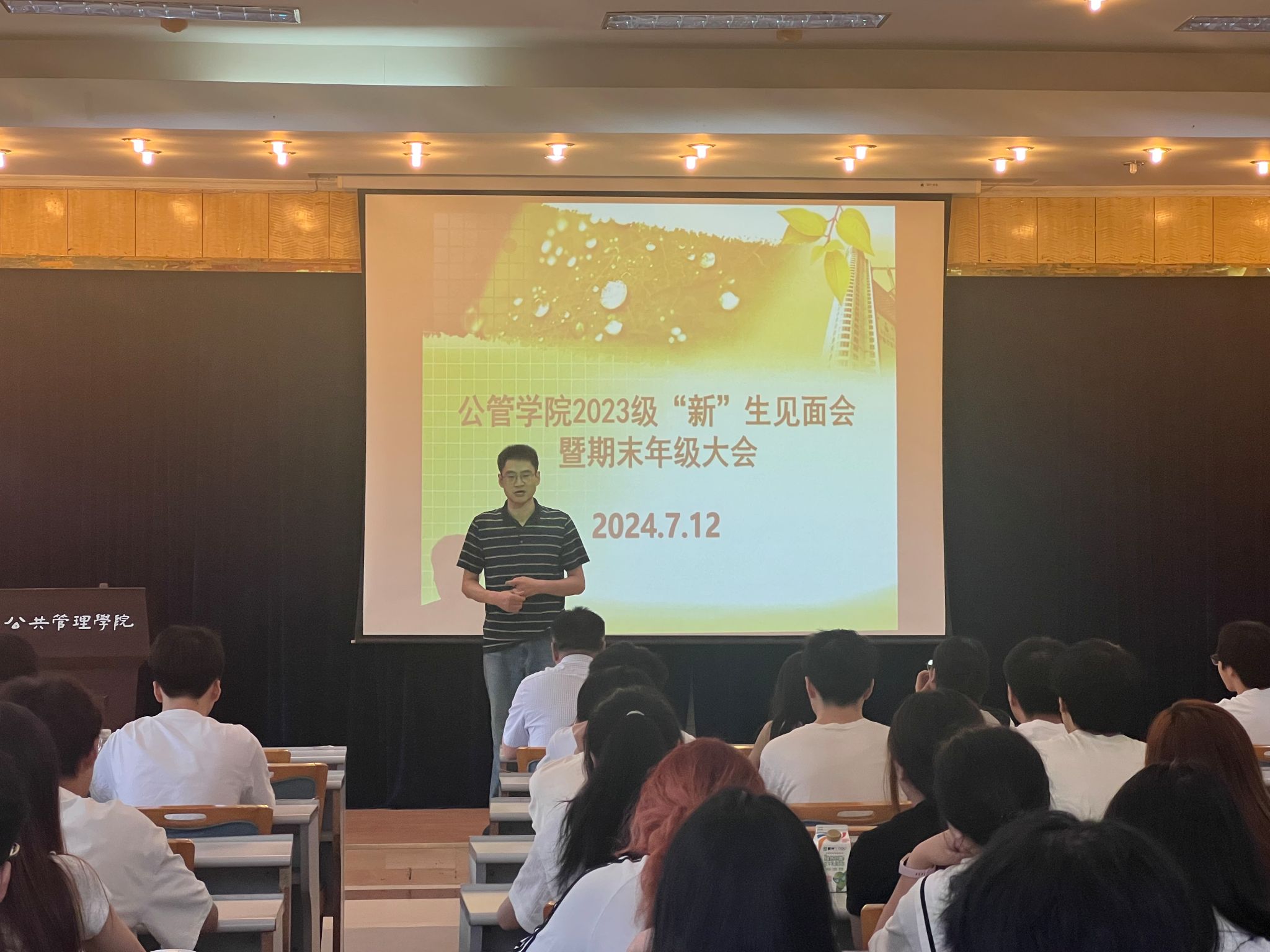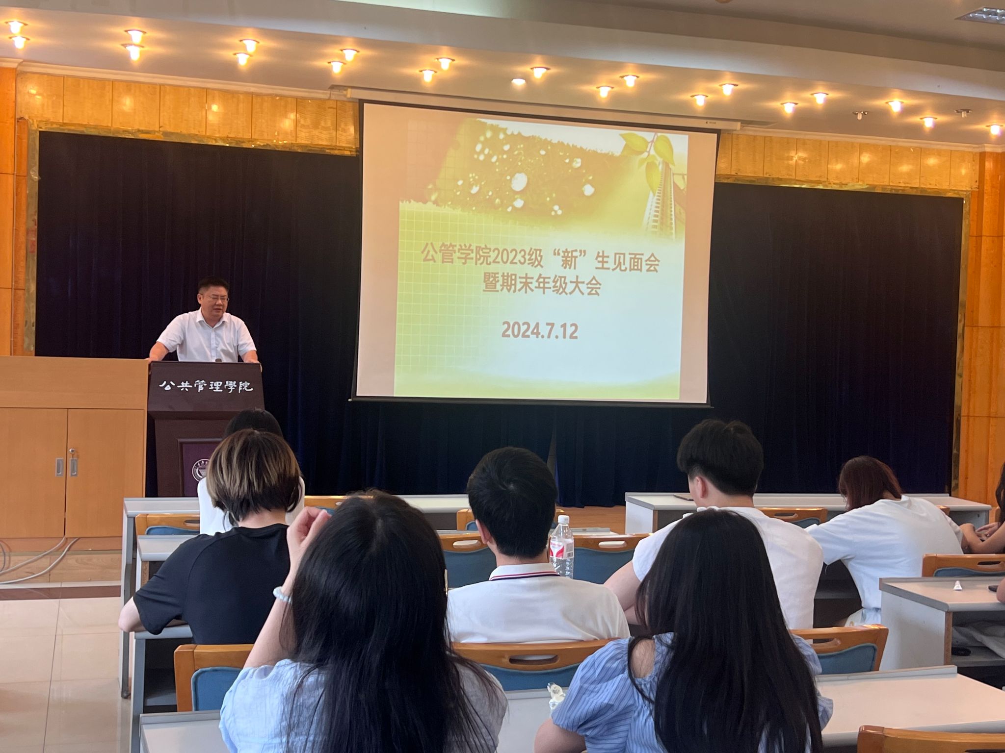 于2024年7月13日上午10点在学院202报告厅召开了2023级本科“新”生见面会暨期末年级大会,学院党委副书记、纪委书记周余斌,副院长丁从明出席了会议。会议由学院2023级辅导员、团委书记徐柳主持,全体2023级本科生到场参加。