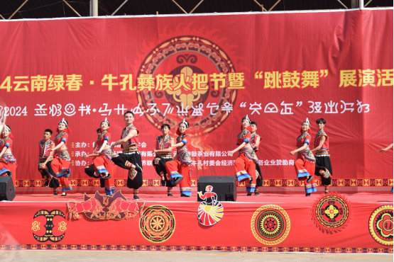 以火之名,欢乐相约;火把相聚,欢歌起舞。傍晚时分的“火舞彝乡”活动更是将节日氛围推向了高潮。“火舞彝乡”由毕摩祈福祭火拉开序幕,上千名各族观众听着古老神秘的毕摩祈福。祭火大典后,会场中间的篝火被点燃,彝家儿女也举起火把,围绕着篝火跳舞。火焰在风中飘荡,使得夜幕下的牛孔镇火光映天,照耀着一张张欢乐的笑脸。伴随着跳动的火苗和音乐的节奏,服务团成员与当地彝族群众、游客也纷纷加入其中,男女老幼,不论民族、不分你我,和着音乐的节拍舞动,陌生人之间的拘谨在这节日的气氛中早已荡然无存。这一刻,传统与现代交织,不同民族的文化相互尊重、共融共生,民族团结的力量得以充分展现。