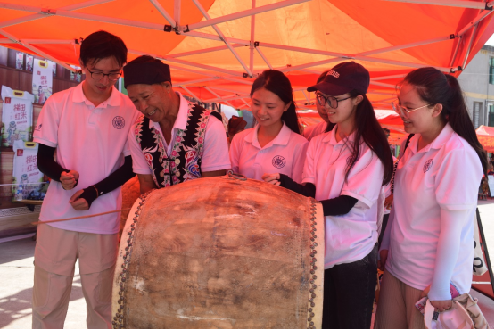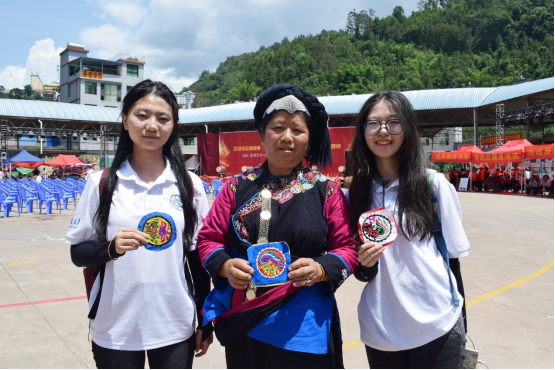 “非遗集市”是本次活动的一大亮点。在广场东侧,分别设置有彝族刺绣、彝族剪纸、彝族服饰、彝文、毕摩文化、竹编、传统歌舞和跳鼓舞展示区。在这里,传统技艺经过匠人们精湛的手艺,在现代社会的不断融合中得以传承,古老传统与现代风貌巧妙融合,绘画出一幅生动的彝族文化长卷。对此,服务团成员纷纷驻足,或欣赏、或体验。当地彝族传统艺人对同学们进行了耐心的现场教学,让同学们直观感受着彝族非遗文化的深厚底蕴和彝族人民的热情。