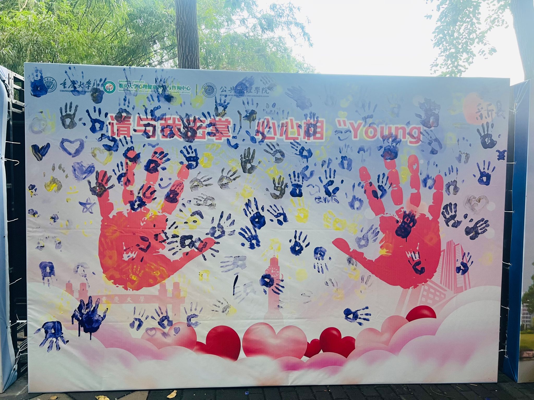 “请与我击掌,心心相‘Young’!”环节创意十足。现场设置手掌涂鸦墙,同学们用多彩颜料印下掌印,以“隔空击掌”的形式直观传递积极情绪与美好祝愿。