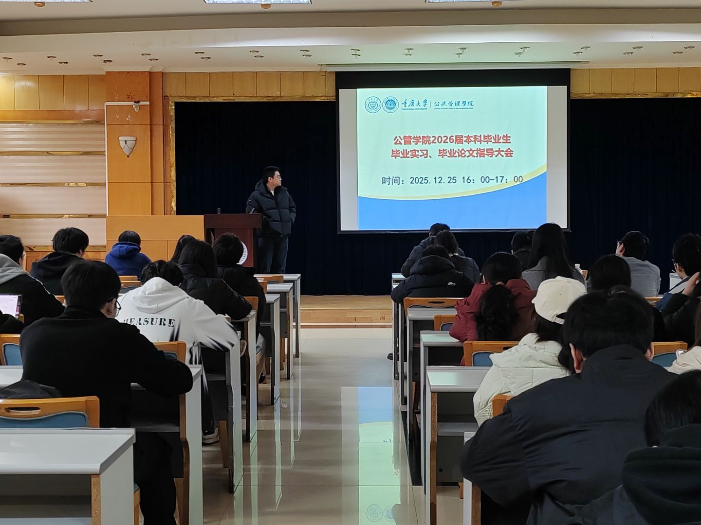为精准赋能2026届本科毕业生稳步推进毕业论文撰写、圆满完成毕业实习任务,2025年12月25日下午16:00,学院在102报告厅隆重召开专题指导大会。学院党委副书记、纪委书记周余斌,副院长丁从明莅临会议指导,会议由2026届本科毕业生辅导员王丽娟主持,全体毕业生齐聚现场参会。
