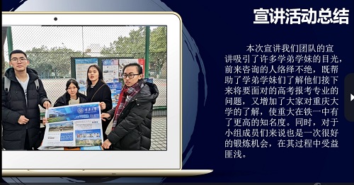 的了解中也体会到了身为学长学姐的自豪感。另一支队伍平南县中学则极具创新能力。他们在宣讲过程中突破了传统的宣讲方式,以讲故事的形式向学弟学妹们分享他们在重大的有趣经历和丰富生活,极大的激发了学弟学妹们对重大的兴趣。在反思中,他们总结道,由于队伍成员都是第一次参加宣讲活动,因此有些经验不足,在介绍专业时也因准备工作不足而没有表现好,但是有了这次的经验,他们会在明年的宣讲中做的更加优秀。