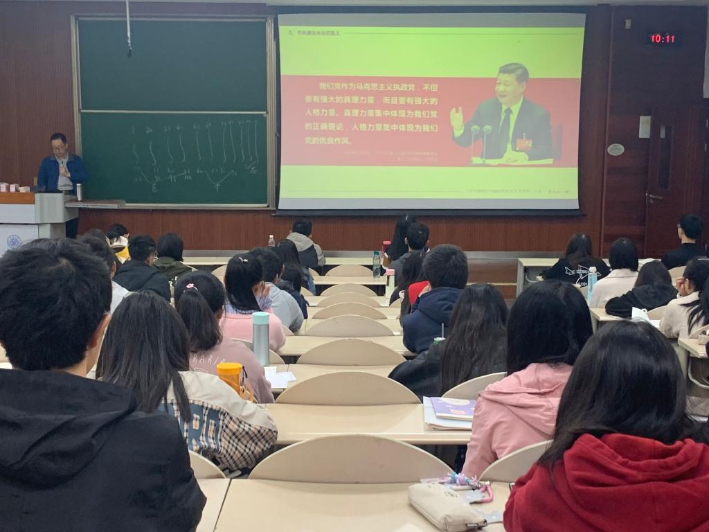 11月10日上午,马克思主义学院马克思主义基本原理教研室副主任蒋楼老师在虎溪校区D1134教室,给入党积极分子讲党课。蒋楼以“毫不动摇把党建设的坚强有力”为题,从“勇于自我革命是党最鲜明品格、党的政治建设是党的根本性建设、把思想建设作为党的基础性建设、建设高素质专业化干部队伍、作风建设永远在路上、用铁的纪律管党治党、不断扎牢制度笼子、夺取反腐败斗争压倒性胜利”等八个方面出发,有针对性地回答了如何理解勇于自我革命是中国共产党最鲜明的品格,为什么说政治建设是党的根本性建设,为什么说思想建设是党的基础性建设,为什么说作风建设永远在路上等新时代党的建设的几个重大理论与现实问题。