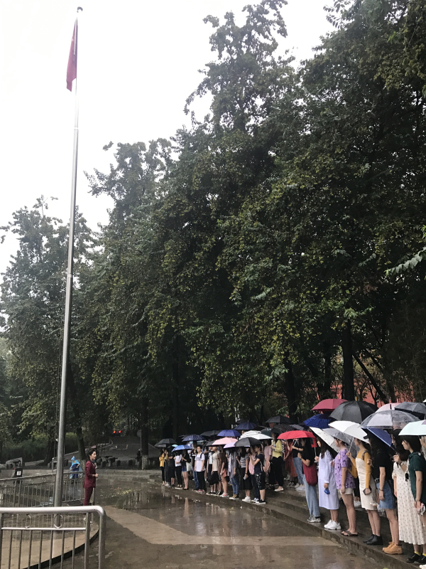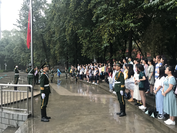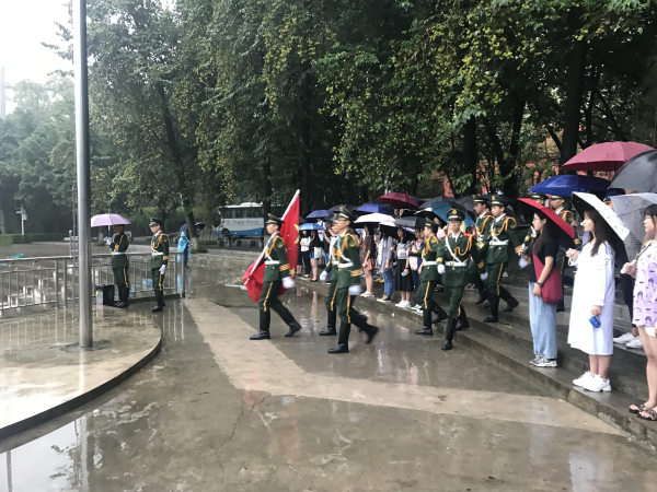 7点05分,随着“国旗班出旗!”的响亮口号,国旗班队员们迈着整齐的步伐庄严走向国旗台。在国旗班护卫队员的引领下,同学们全体肃立,随着“升国旗,奏国歌”的号令,嘹亮的国歌声随之响起,一名国旗班护卫队员将国旗高高抛起,鲜红的旗帜迎风飘扬。虽然是下雨天,同学们却纷纷主动收起雨伞,行注目礼、高唱国歌,由衷地表达自己对祖国的热爱和敬意。