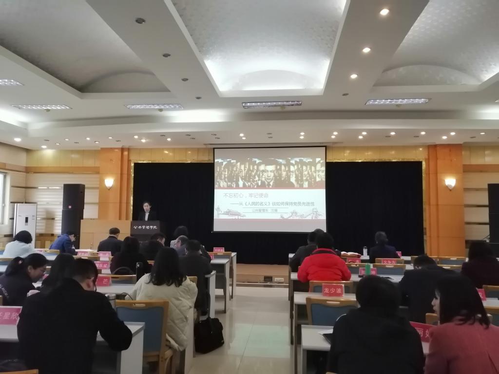 党委在学院二楼多功能厅组织全体教职工开展政治学习。学院公共管理学系青年教师沈珊以《不忘初心,牢记使命——从“人民的名义”谈如何保持党员先进性》为主题讲党课,讲解党员先进性的具体体现和如何保持教师党员的先进性。学习由学院党委书记张邦辉主持。