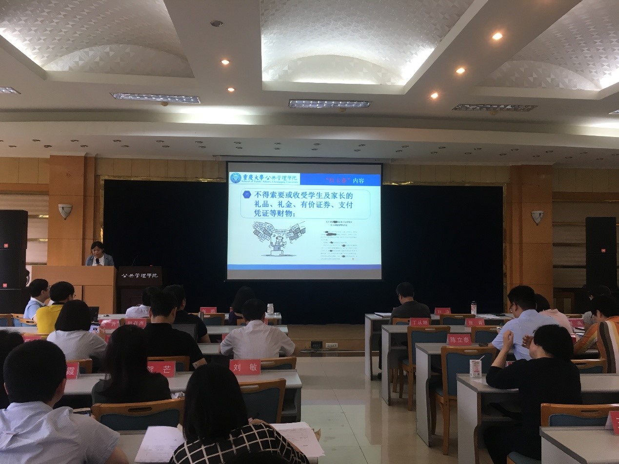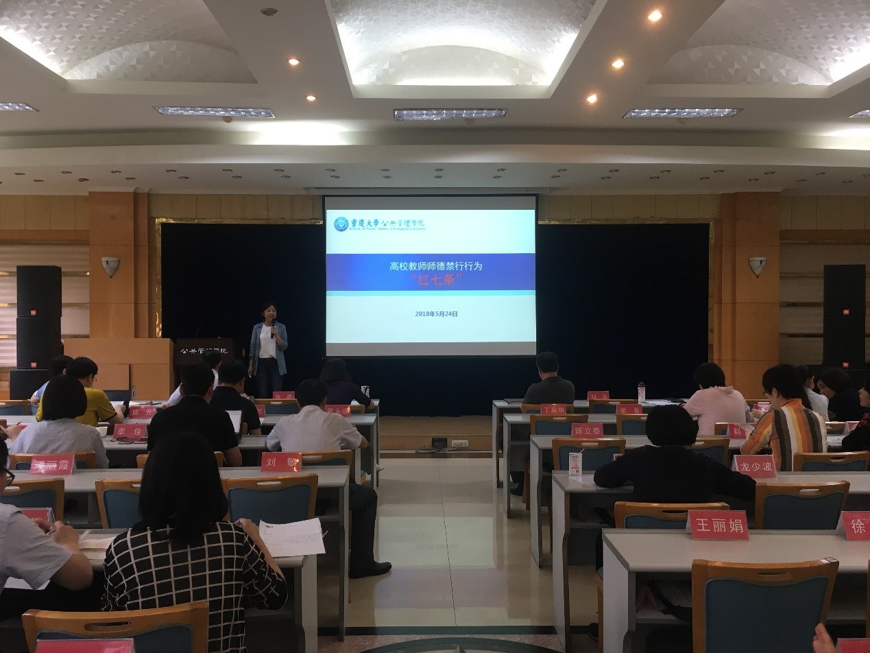 党委于5月24日下午3点组织了《关于印发<关于建立健全师德建设长效机制的实施意见(修订)>的通知》(重大委〔2018〕5号)专题学习会。全院教师在学院二楼多功能厅进行了学习。学习由学院党委副书记、纪委书记刘淳主持。