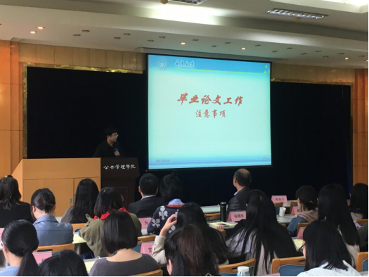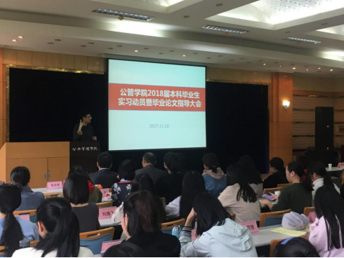 2018届本科毕业实习动员暨毕业论文指导大会在学院二楼多功能厅举行。出席本次大会的有副院长李志教授、公共管理学系主任陈永进教授、副主任刘晓民教授,公共经济学系主任丁从明教授、学院教务办朱宇老师、周聆老师。本次大会由本科2014级辅导员徐柳老师主持,本科2014级全体同学参加此次会议。