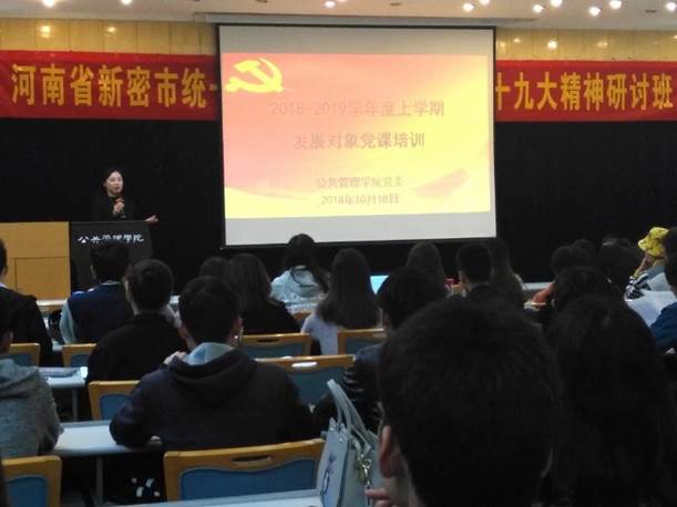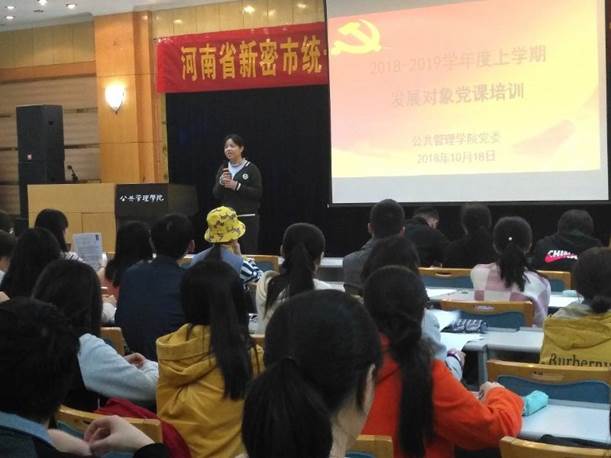 2018年10月18日晚6点半,学院党委组织本学期发展对象在202多功能厅进行党课培训。本学期发展对象、支部书记、支委等70余人参加了培训。本次培训由学院党委副书记、纪委书记刘淳主持,由组织员何薇老师主讲。