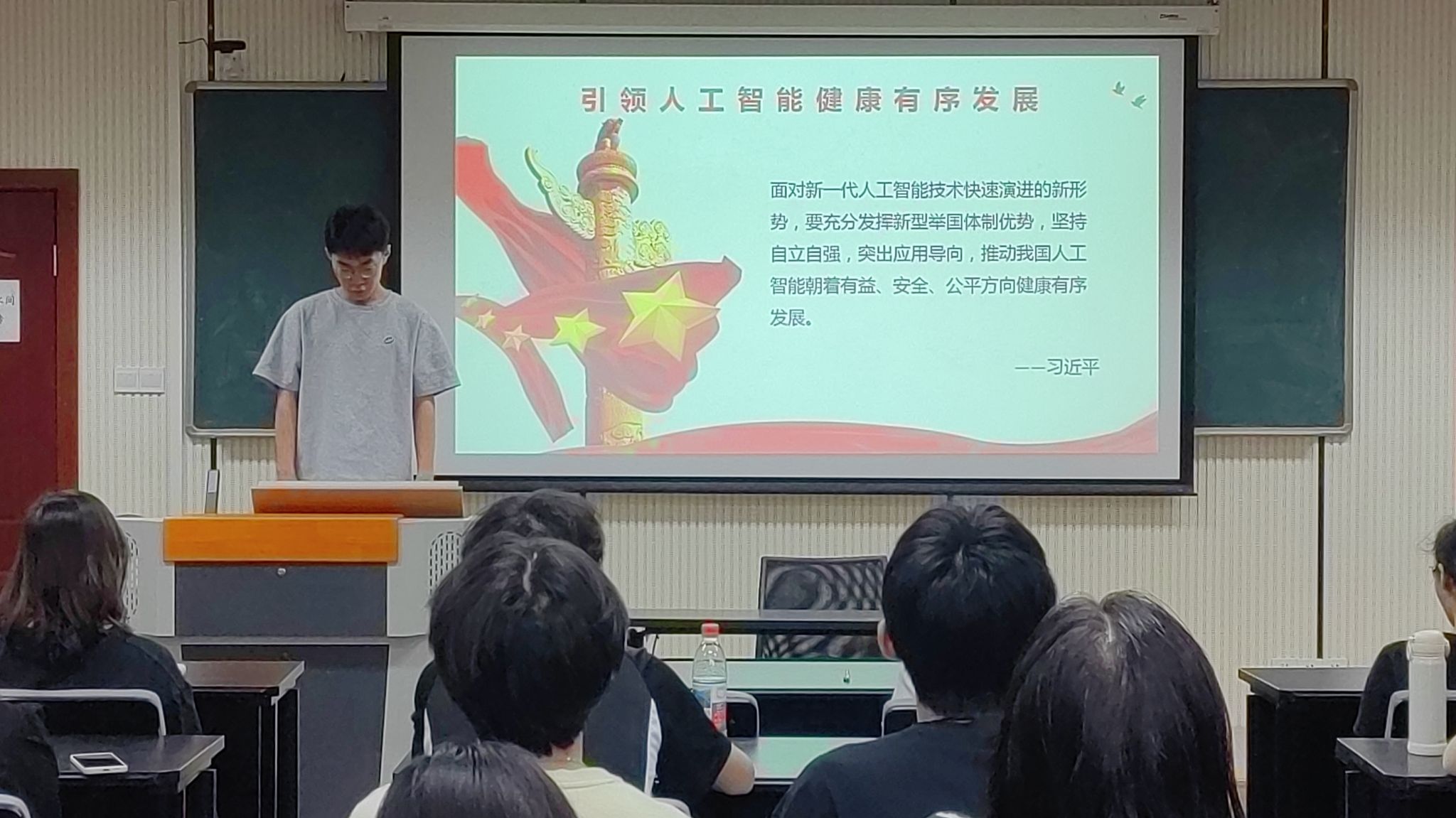 本科生一、四支部在学院楼106教室举行“样板支部新征程,凝心聚力助成长”之党建引领人工智能有序发展主题党课活动。本次活动深入学习贯彻习近平总书记关于人工智能发展的重要指示精神,结合党的建设工作领导小组会议与教育部党组会议的最新要求,探讨人工智能技术发展与监管的平衡路径,由本科生一支部书记王丽娟组织,本科生四支部预备党员王焙琪主持,一、四支部的全体党员、预备党员都积极参与。