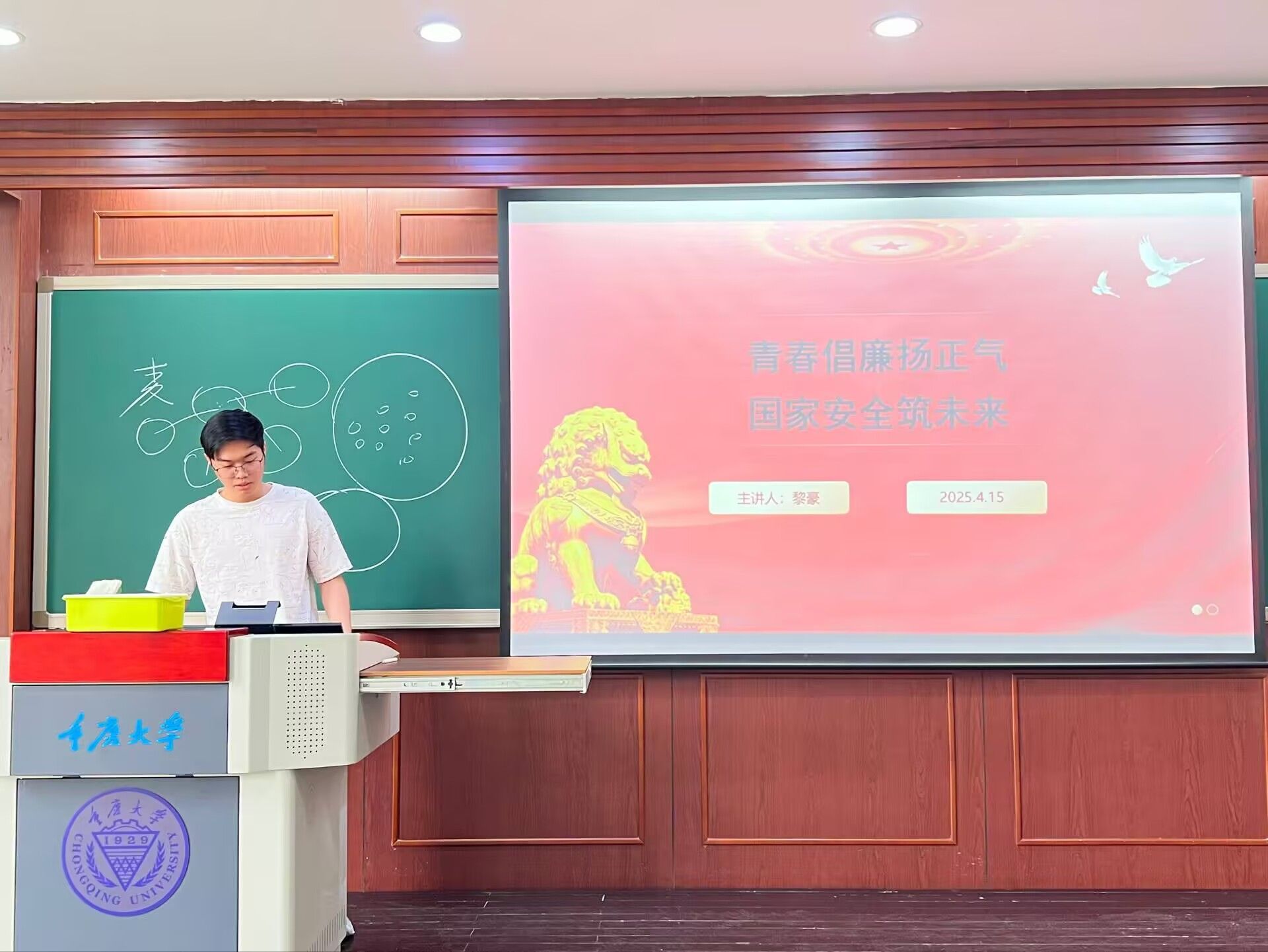 随后,活动进入国家安全教育环节。经济学01班团支书黎豪深入剖析了总体国家安全观的重大意义、国家安全的相关法律规定及实践路径。他结合当前国际形势,阐述了国家安全与每个人的息息相关,鼓励同学们要增强维护国家安全的责任感和使命感,积极投身国家安全教育实践。