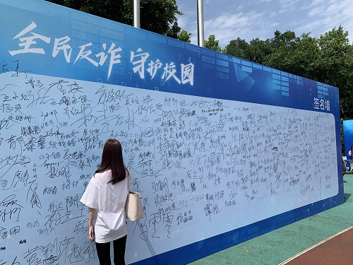 虽然烈日炎炎,但党员同志的防骗防诈热情不减。学院全体参加党员提前在综合楼路口集合,共同前往活动现场。到达重庆城市管理职业学院后,带队老师首先在签到处签到,并给同学们简单介绍了整个启动仪式的流程。接着,师生们依次在“全民反诈 守护校园”签名墙上签字,表达自己的反骗反诈决心。随后在指定位置落座,观看启动仪式。