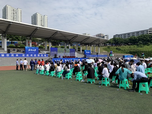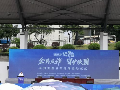 仪式正式开始,首先由人民网重庆频道副总编辑、重庆发布执行总编辑曹阳介绍活动情况;之后,重庆城市管理职业学院党委书记任波致欢迎辞,向到场高校代表及企业代表表示诚挚的欢迎;接着在市委宣传部新闻发布处副处长张晓川的主持下,各位出席领导进行了简要发言,向到场人员进行防骗防诈宣传教育。