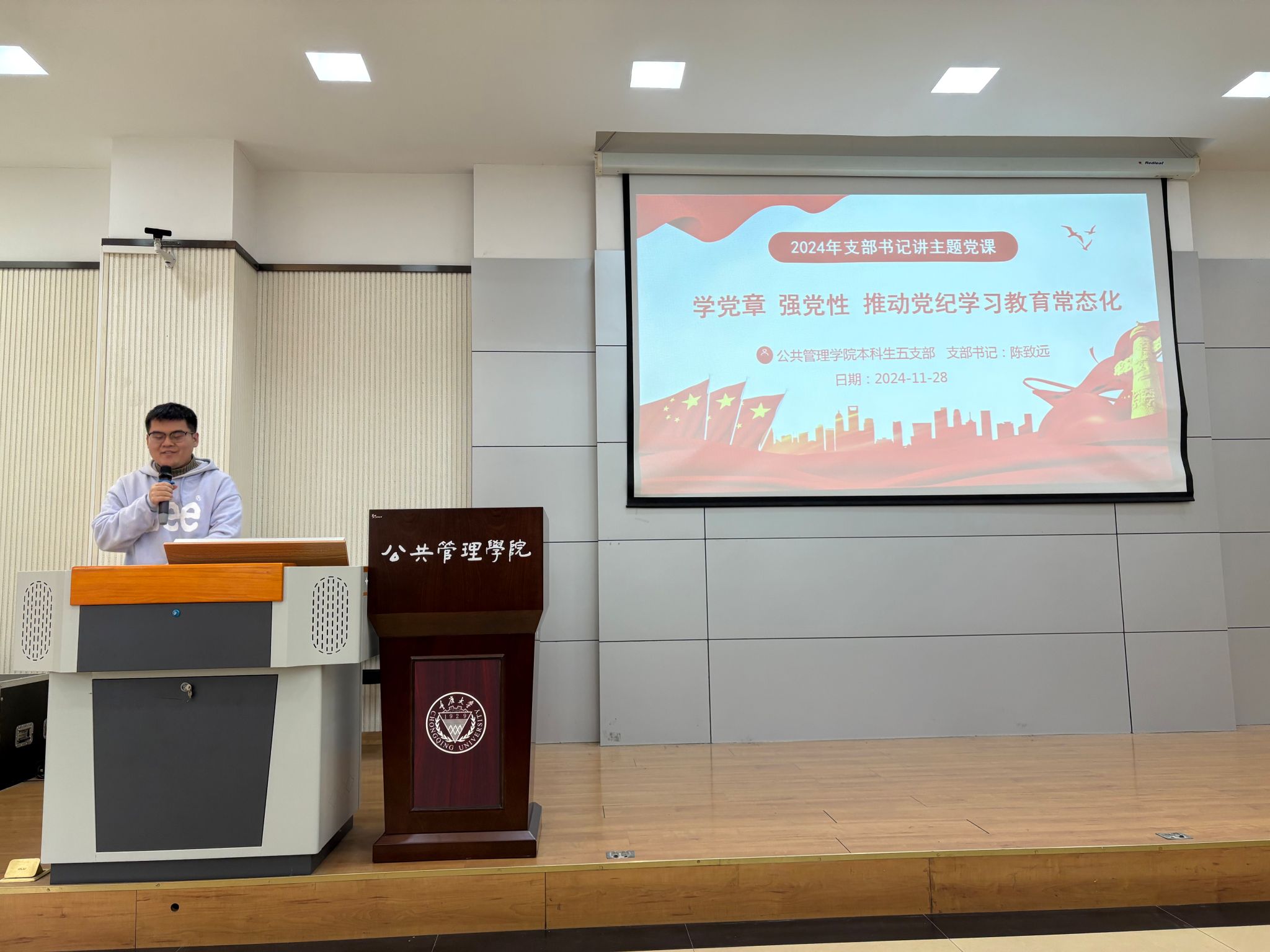 本科生二支部书记徐柳、五支部书记陈致远于2024年11月28日中午在学院102教室为两个支部全体党员讲授了“学党章 强党性 推动党纪学习教育常态化”的主题党课。