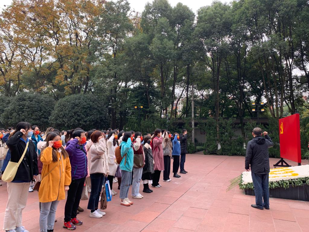 首先,在支部书记的讲解下,同志们对于歌乐山的红岩故事有了更加深入的了解,均被共产党人坚定的崇高理想、百折不挠的革命斗志、视死如归的献身精神所震撼。接着,袁晓浩同志带领新入党同志在烈士墓前进行宣誓。同志们举起右手,目光坚定,嘹亮的宣誓声萦绕在耳边。“我志愿加入中国共产党,拥护党的纲领,遵守党的章程,履行党员义务,执行党的决定,严守党的纪律,保守党的秘密,对党忠诚,积极工作,为共产主义奋斗终身,随时准备为党和人民牺牲一切,永不叛党。”随后,在烈士墓前,全体同志怀着崇高的敬意,肃立默哀,向为革命事业献出宝贵生命的烈士致敬。