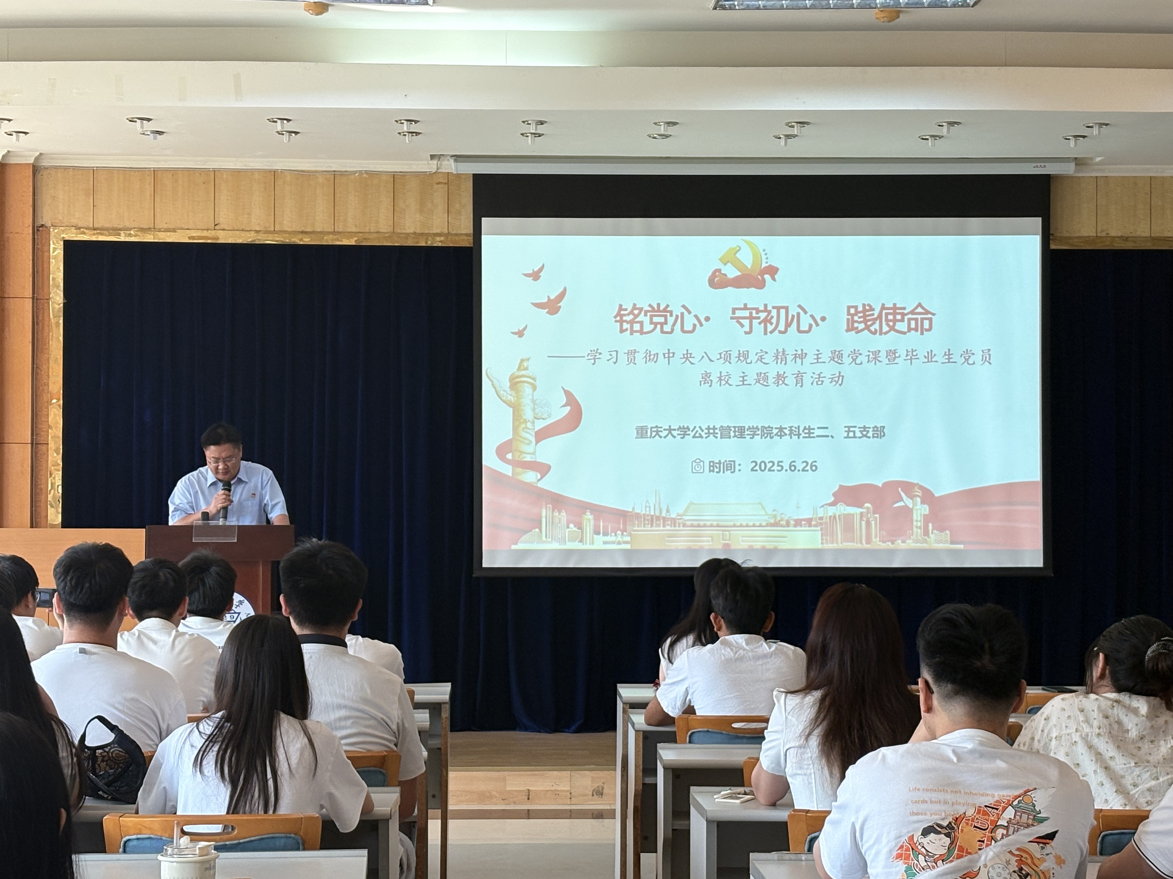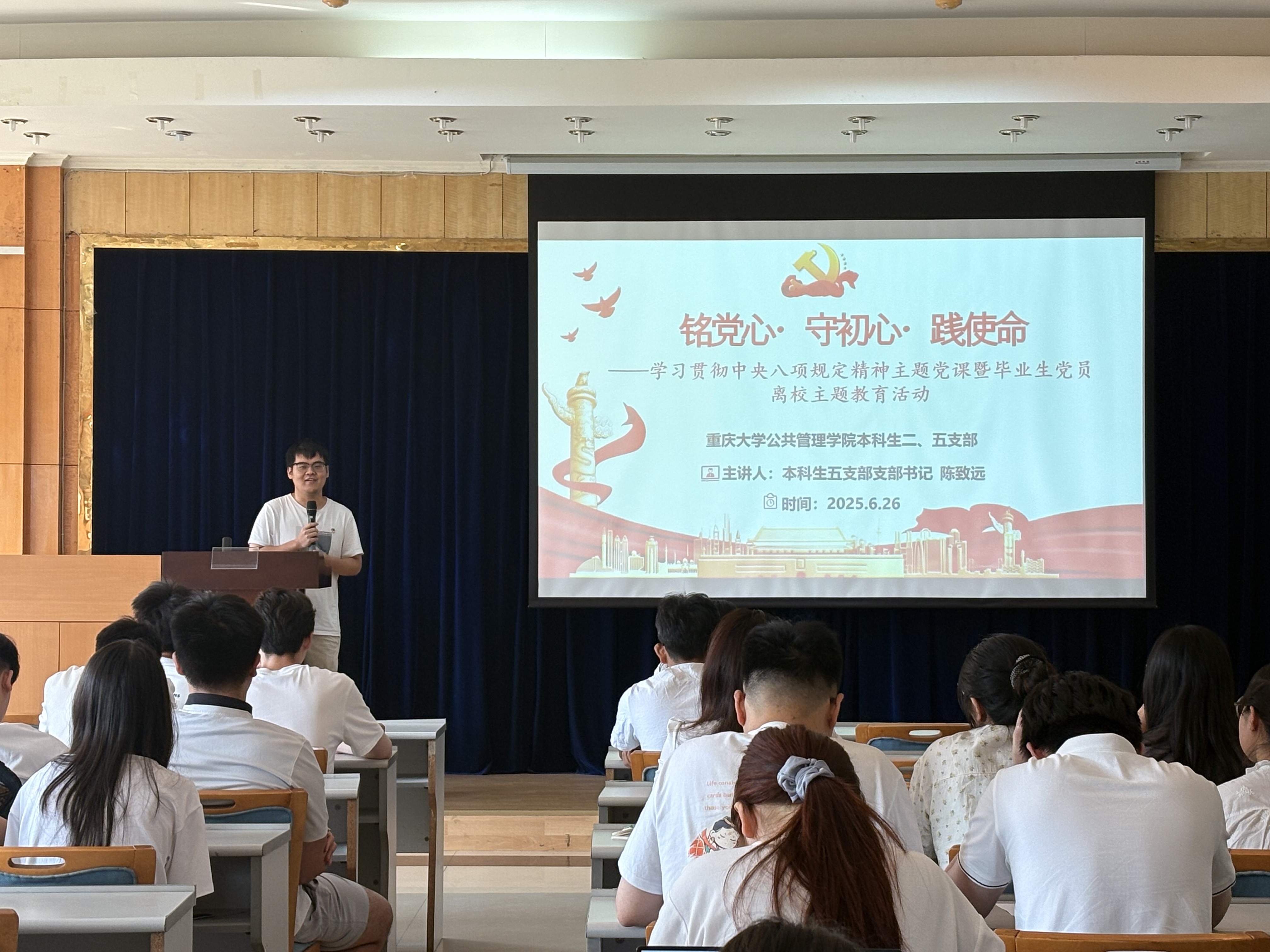 为深入学习贯彻中央八项规定精神,扎实推进基层党支部作风建设走深走实,进一步强化对毕业生党员的离校教育工作,2025年6月26日下午15:00,学院开展了“铭党心·守初心·践使命”学习贯彻中央八项规定精神主题党日暨毕业生党员离校主题教育。活动由本科生二支部书记徐柳主持,本科生二、五支部全体党员参加。