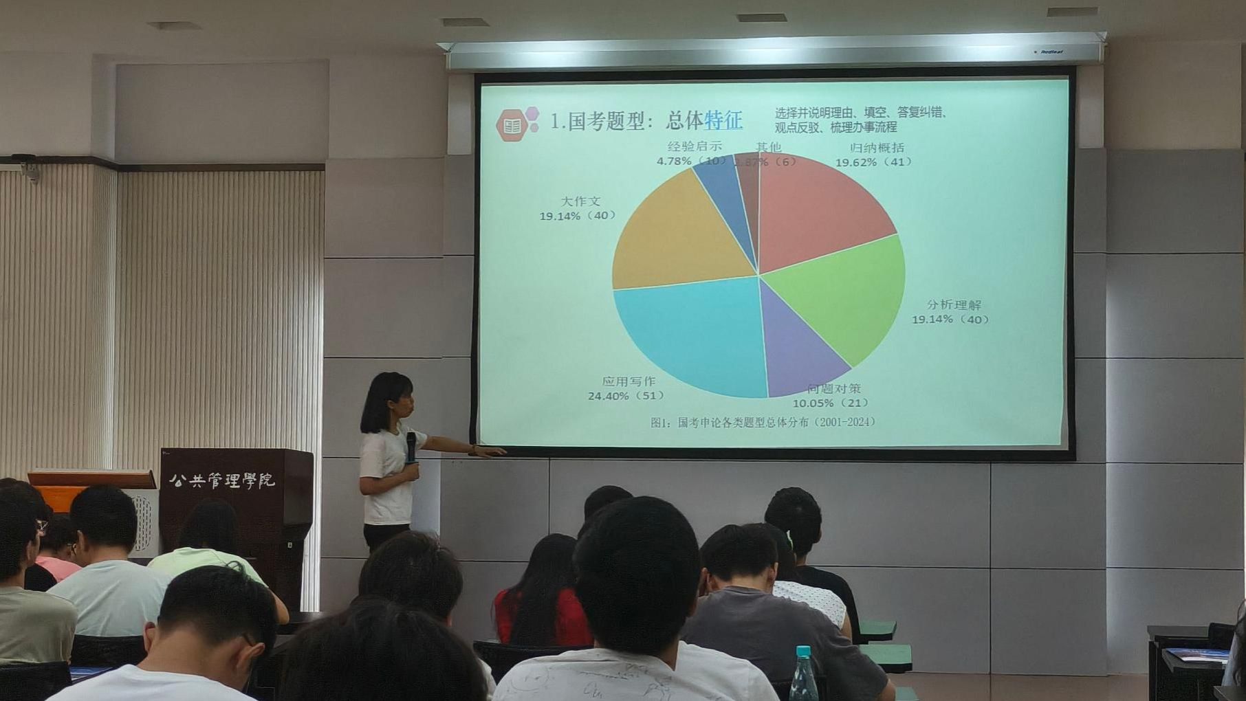 本科生一、四支部开展“样板支部新征程,党建引领办实事”系列活动。行管系龚宏龄副教授在102会议室以“申论高分如何炼成?”为主题开展专题讲座。讲座从题型规律、能力拆解到实战策略,为考生搭建系统备考框架,深度解码申论提分技巧。学院本科生一、四支部全体党员、预备党员、入党积极分子及有考公意向的100余名同学都积极到现场参与。