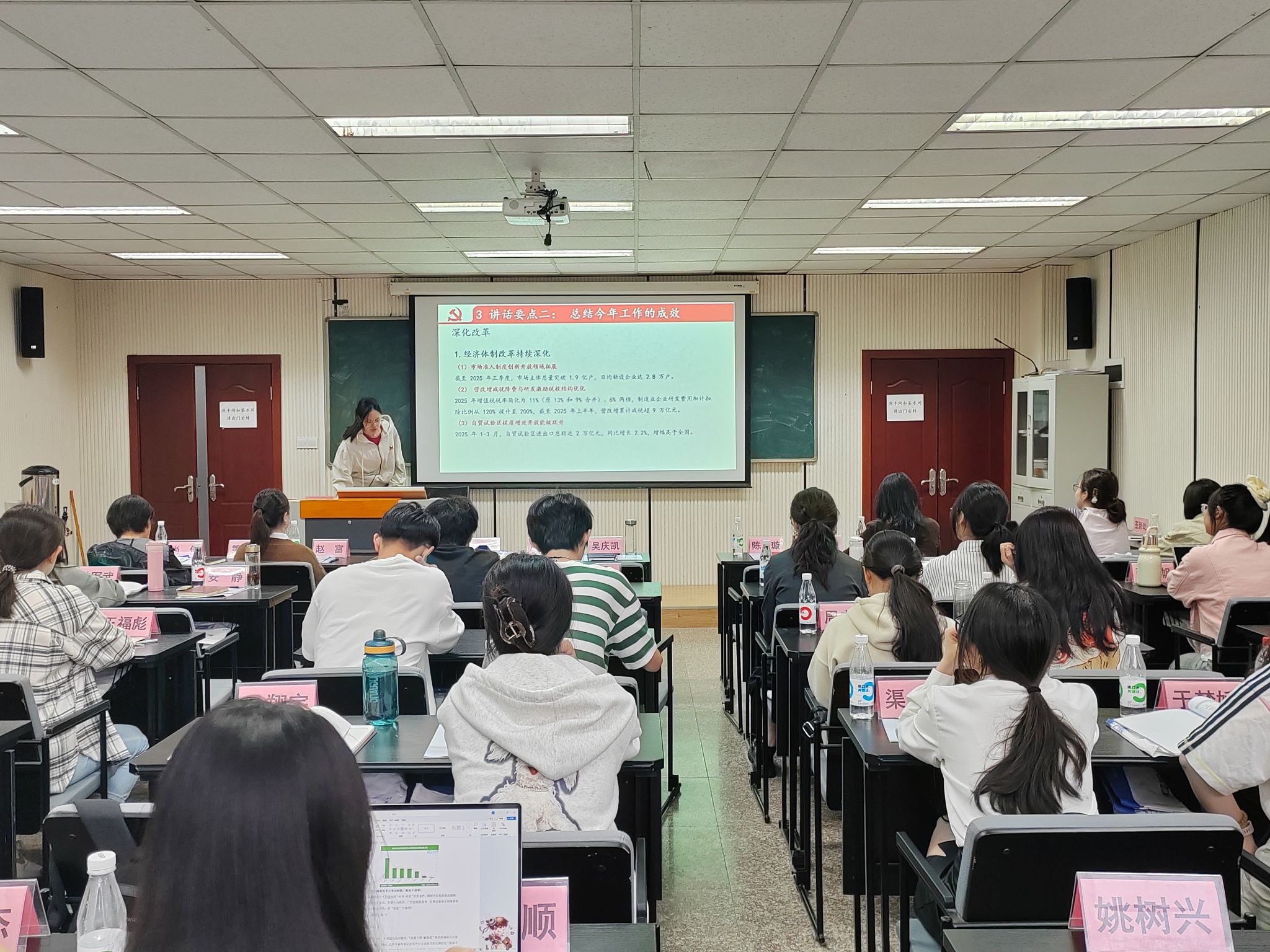 本科生一、四支部在学院楼106教室举行“样板支部新征程,凝心聚力助成长”之“学习习近平在庆祝中华人民共和国成立76周年招待会上的讲话”支部党员大会。本次活动深入学习贯彻习近平总书记在国庆招待会上的讲话精神,结合党史发展历程,明确新征程“十五五”规划战略意义。活动由本科生一支部书记王丽娟主持,本科生一支部党员冉静怡和许诺主讲,一、四支部全体党员、预备党员积极参与。