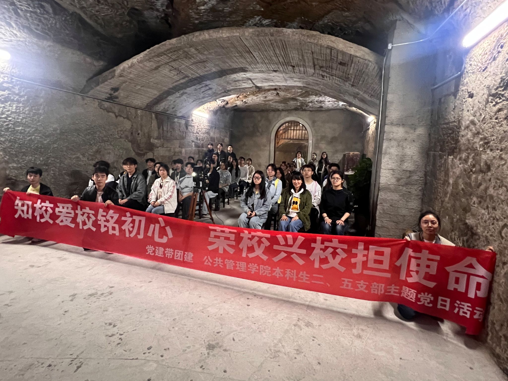 防空洞爱国主义教育基地,一场以党建带团建“知校爱校铭初心,荣校兴校担使命”为主题的党日活动在此拉开帷幕。本科生二支部书记徐柳、五支部书记曹李思帆带队,全体成员一同在斑驳的历史印记中,开启了一场兼具校史学习与精神洗礼的特殊旅程。