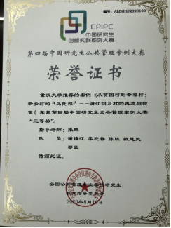 Under the guidance of Zhang Peng, professor and vice dean of the school of public management affairs, our team (Xie Zhenjiang, Li Yingpu, Luo Meng, Chen Sheng and Jing Huiling) completed the research and case writing work through a combination of field study and telephone interviews despite all the difficulties brought by the coronavirus pandemic. In the end, 32 teams achieved to the national final, and our team's work "From poor village to happy village: the new village of ‘Utopia’ - Pujiang Mingyue village re-creation and transformation" won the third prize.