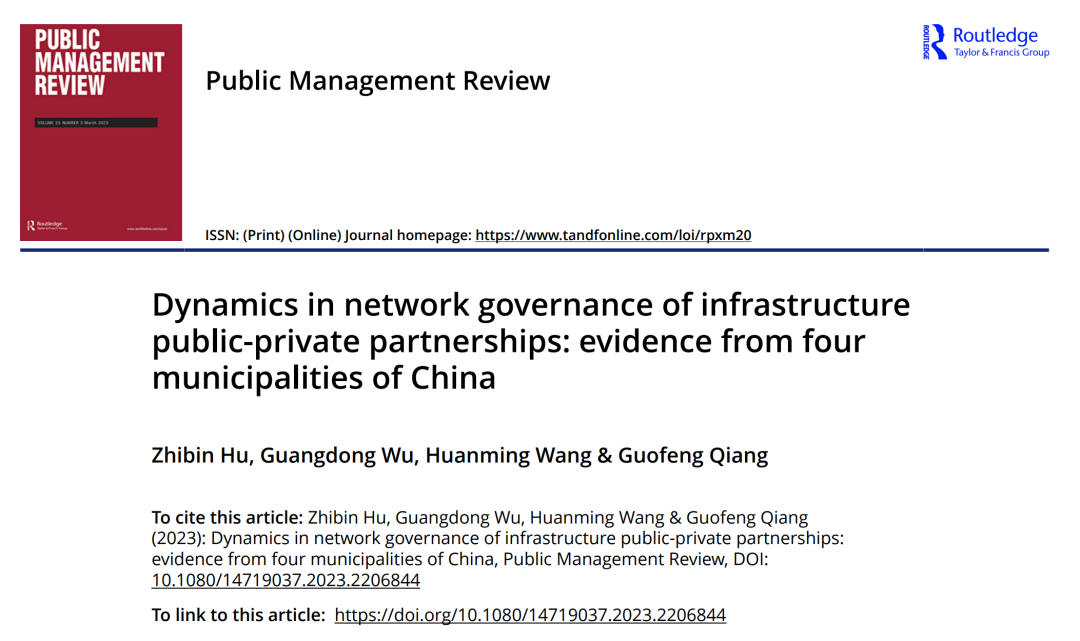 吴光东教授作为通讯作者的文章《Dynamics in network governance of infrastructure public-private partnerships: evidence from four municipalities of China》在公共管理学科顶尖期刊Public Management Review在线发表。Public Management Review期刊在管理学类别中位于一区(Q1),影响因子在公共行政和公共政策领域SSCI期刊中位列第三,是公共管理学科五大权威期刊之一。该文章是由吴光东及其指导的博士研究生胡志斌(论文第一作者,在线色情