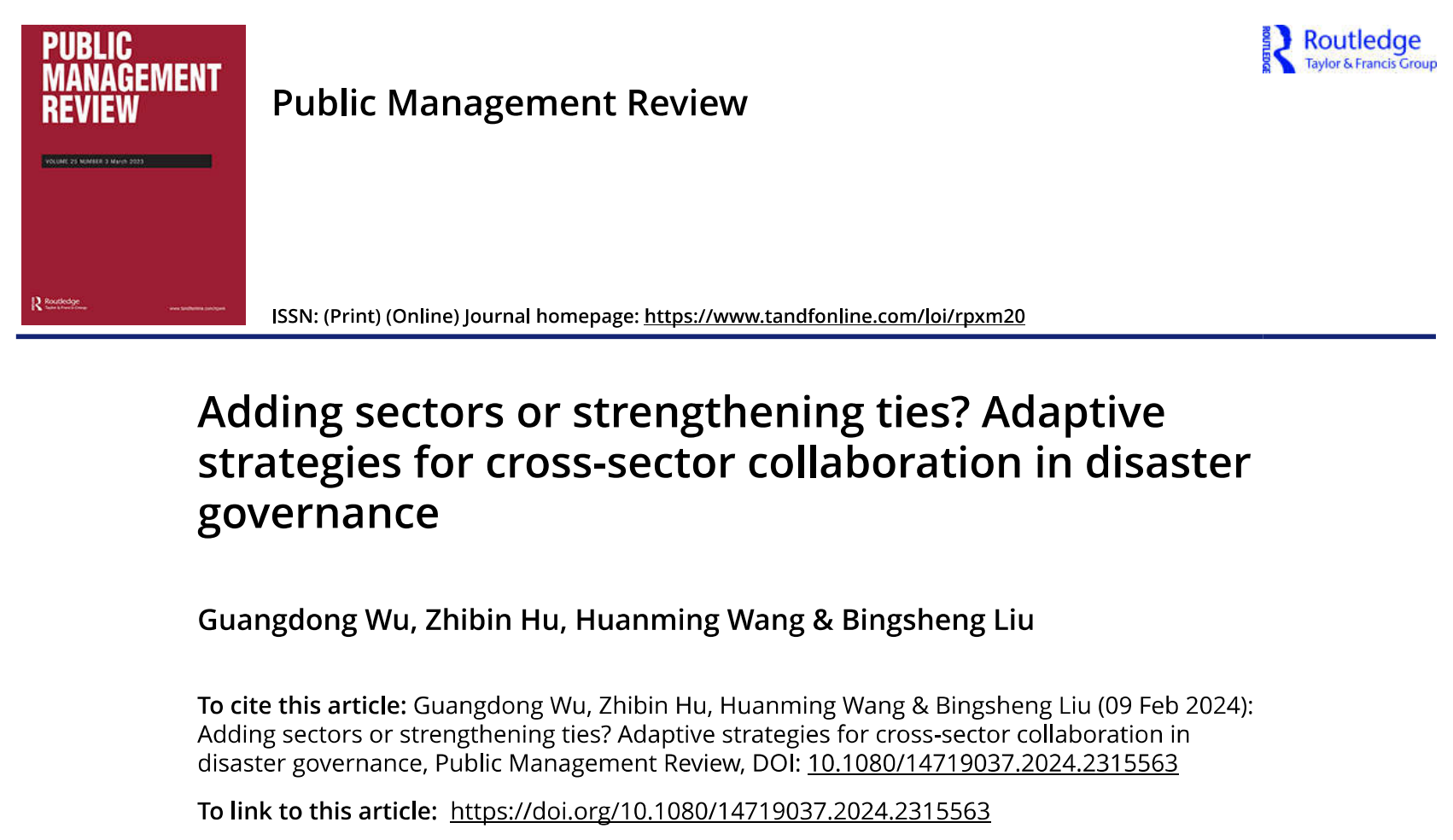 吴光东教授作为第一作者的研究成果“Adding Sectors or Strengthening Ties? Adaptive Strategies for Cross-Sector Collaboration in Disaster Governance”在公共管理学科顶尖期刊Public Management Review发表。该期刊在管理学类别中位于一区(Q1),影响因子在公共行政和公共政策领域SSCI期刊中位列第三,是公共管理学科五大顶尖期刊之一。该文章由吴光东教授及其指导的博士研究生胡志斌(在线色情