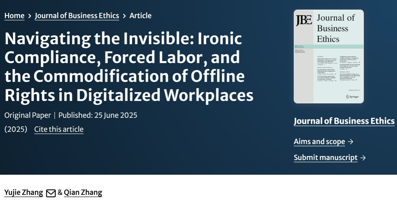 张煜婕博士作为第一作者及通讯作者的学术论文《Navigating the Invisible: Ironic Compliance, Forced Labor, and the Commodification of Offline Rights in Digitalized Workplaces》(驾驭无形:青年员工的数字离线权)正式发表于商业伦理领域国际权威期刊 Journal of Business Ethics(JBE)。