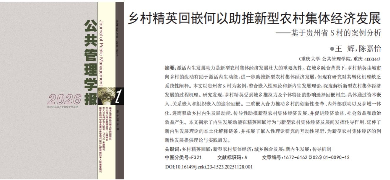王辉教授作为第一作者的研究成果《乡村精英回嵌何以助推新型农村集体经济发展——基于贵州省 S 村的案例分析》在公共管理高水平中文期刊《公共管理学报》(2026年第1期)上发表。《公共管理学报》由哈尔滨工业大学管理学院主办,刊载的学术论文主要涉及“政府管理、公共政策分析、公共卫生管理、社会保障”等与公共管理学科有关的研究主题,在研究方法上注重以事实为基础的实证研究,强调研究成果在中国场景下的适用性和应用价值,是中国管理类期刊中高水准的学术平台。该论文是由王辉教授及其指导的硕士生陈嘉怡共同完成。