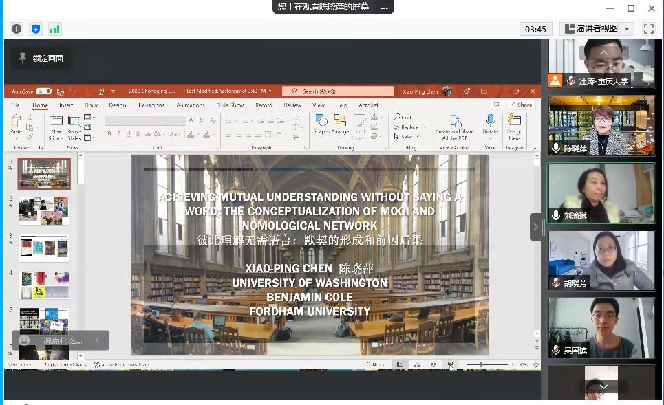 In order to further broaden the horizons of teachers and students, explore academic interests, and inspire scientific research ideas, at 10:00 a.m. on March 4, 2022, the School of Public Administration and Policy (SPPA) at Chongqing University held an online lecture with the theme of "Understanding Each Other Without Language: The Causes and Consequences of Tacit Understanding". The keynote speaker of this lecture is Professor Chen Xiaoping, Ph.D. in Industrial and Organizational Psychology at University of Illinois, Academician of the American Academy of Management, and Academician of the American Psychological Association. The lecture was presided over by Professor Liu Yulin, Associate Dean of SPPA.