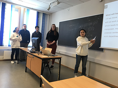 4月5日,主要是小组汇报,小组成员分别由两名挪威学生和三名中国学生组成。第一组同学用ppt加视频呈现的方式向大家讲解了中挪社会工作的异同点、挪威的福利模式等,向大家重点对比讲解了中挪临终关怀社会服务和庇护所服务的异同点。我们看到了在不同文化和社会背景下,人们在遭遇家庭暴力时的不同选择。第二组同学以ppt结合戏剧的形式向大家重点讲解了中国的留守儿童问题,由于两国的不同情境,挪威并未有留守儿童问题,采用戏剧表演便于挪威同学更好地了解中国的留守儿童问题。汇报结束后,双方老师都给出了中肯的评价与建议,思想碰撞出的火花使今天变得格外不同又有意义。