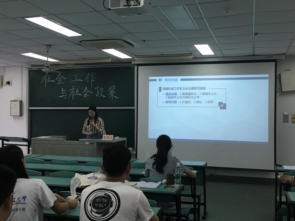 王雪燕同学就论文《再论社会工作本土化——基于社会信任视角》一文在分论坛“社会工作与社会政策”做出了学术报告,指出社会工作涵盖理论、技能、价值于一体,本质上是利他主义的社会互动。互动的基础是信任,即信任是社会工作服务开展的前提。我国社会工作本土化进程中,重改造理论和技能、轻培养信任文化导致实务困境。基于文化路径和制度路径构建高信任度的社会信任,提出营造良好的信任文化有利于推动社会工作本土化进程。该分论坛点评人何雪松教授做出了点评,并提出宝贵的指导意见。王珊同学在分论坛“共享发展的社会福利与社会工作论坛”做了学术报告。