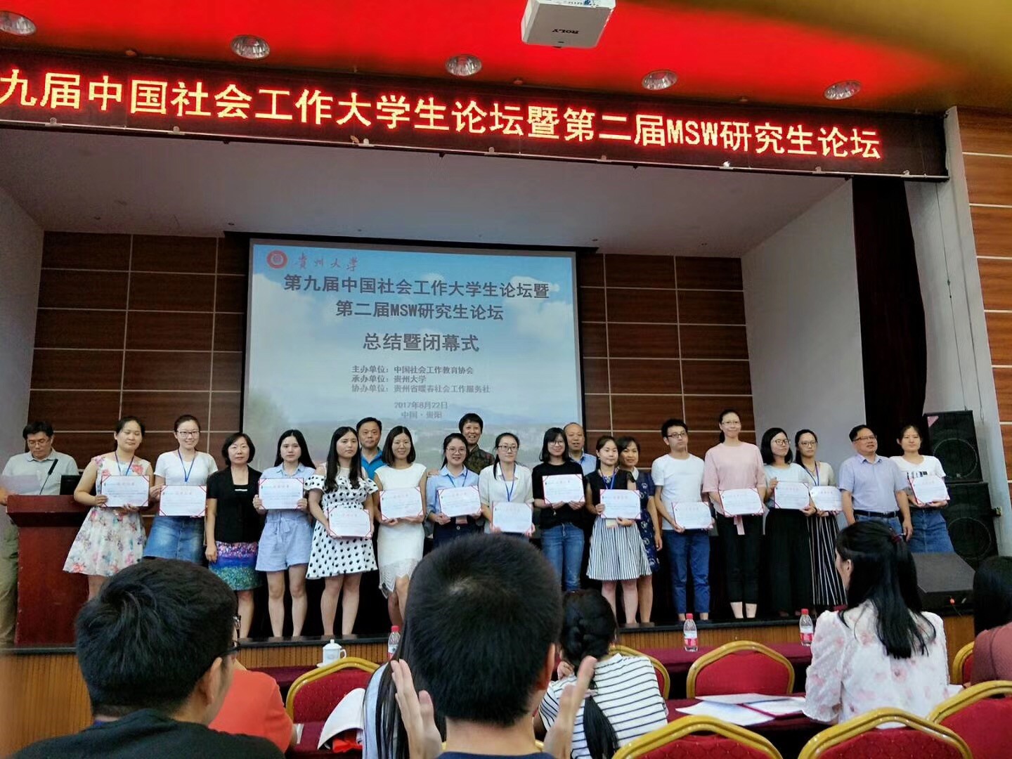 第九届中国社会工作大学生论坛暨第二届MSW研究生论坛在贵阳举行,论坛由贵州大学承办,来自全国200多所学校的师生齐聚此次论坛。中国社会工作大学生论坛暨MSW研究生论坛是由中国社会工作教育协会、全国社会工作专业学位研究生教育指导委员会联合主办、面向全国社会工作专业大学生的一项重要的学术交流活动,是当前国内社会工作界最高水平的学生学术论坛。中国社会工作教育协会常务副会长关信平教授、中国社会工作教育协会副会长兼秘书长马凤芝教授、贵州大学骆长江书记、贵州省民政厅杨亚军书记等人出席此次论坛。
