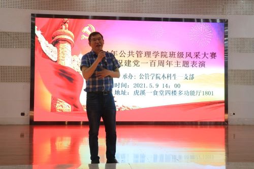 短片观看完毕,主持人向在场的观众依次介绍了本次大赛的评委嘉宾,并邀请学院党委副书记袁晓浩上台致辞。袁书记说到:“我们同学一定要牢记来到学校的目的,不忘初心,砥砺前行。在建党一百周年到来之际,将自己的梦想,同班级的梦想,学院的梦想,国家的梦想结合起来,一起去奋斗!”