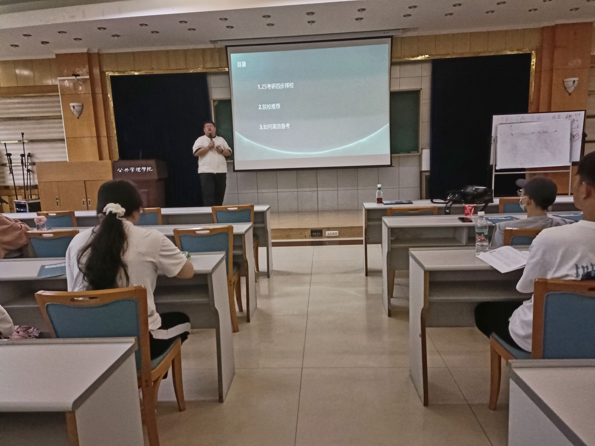 专业和学生的实际情况,为升学考研的同学们将要报考的专业和学校进行针对性分析,举例说明报考学校专业往年报考分数情况,给予同学们六部择校法和工具,帮助同学们进行科学择校。胡老师从考研四步择校、院校推荐与如何高效备考三个维度出发,为同学们带来贴心指导。会议最后,胡老师针对同学们个性化需求,详细指导同学们如何进行择校,并为同学们推进了几所优质院校。