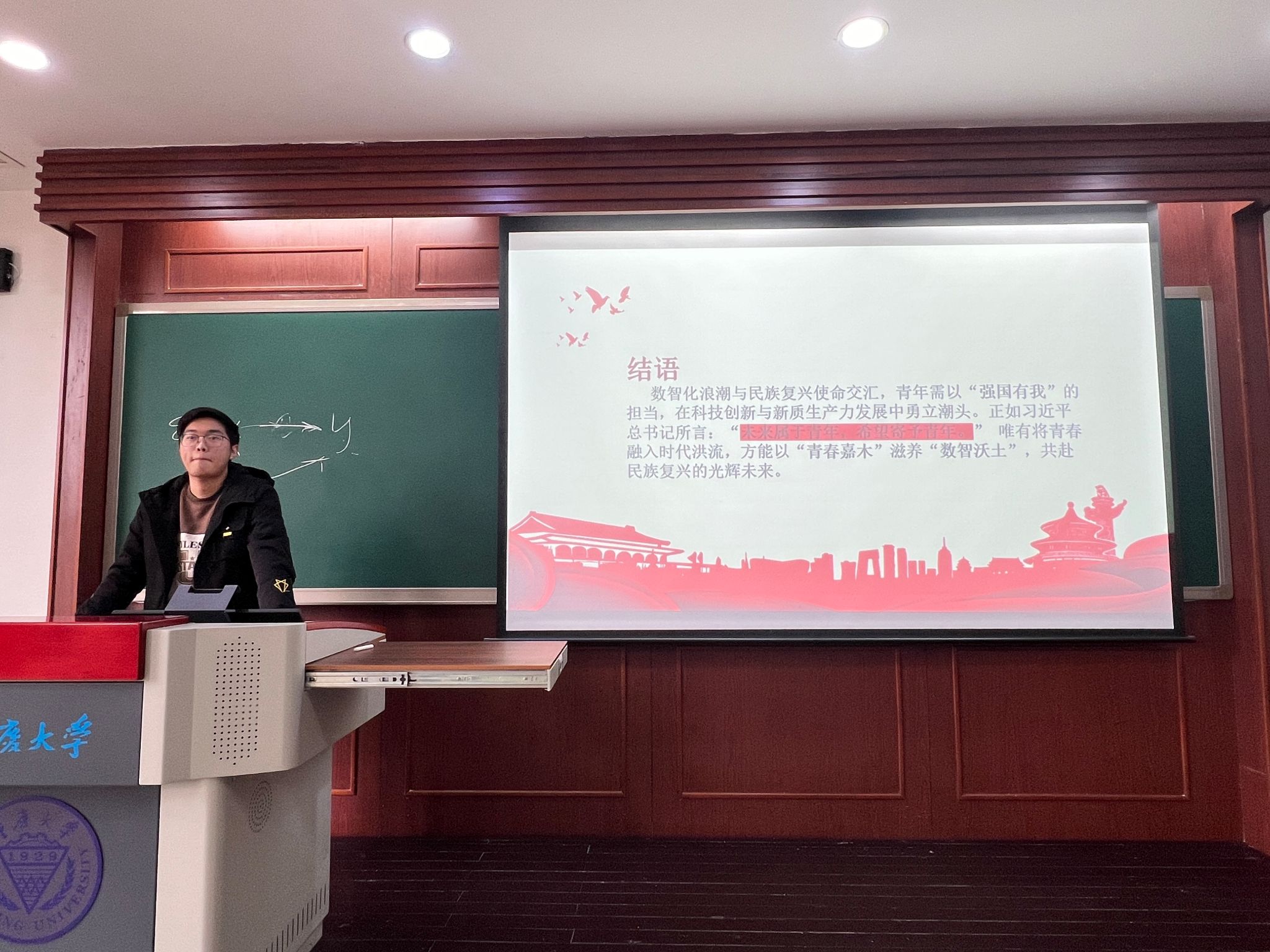 紧接着,团支书围绕“数智甘霖滋沃土,青春嘉木向未来”这一主题,从理论层面到实践层面进行了全面而深刻的讲解。他指出,作为新时代的青年学子,我们要深刻理解新质生产力的概念及其重要性,认识到新质生产力是顺应技术的经济需要,是构筑优势的战略选择,是中国式现代化的建设要求。在此基础上,我们应该积极投身到改革实践中去,用自己的实际行动践行青春誓言。